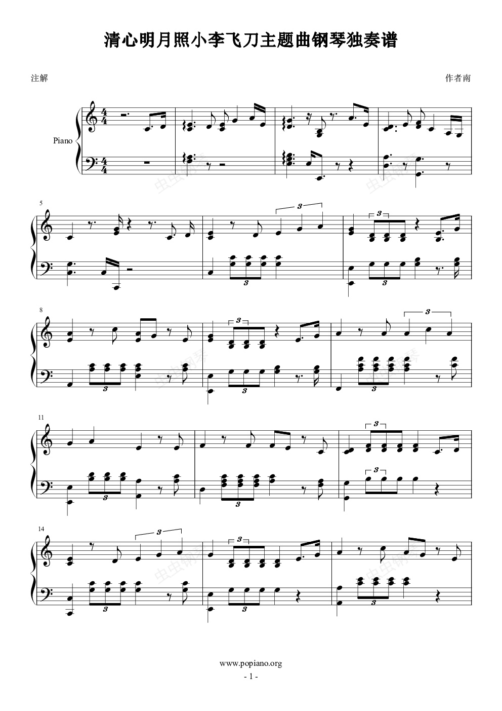 钢琴谱:95港版小李飞刀主题曲清心明月照钢琴独奏谱