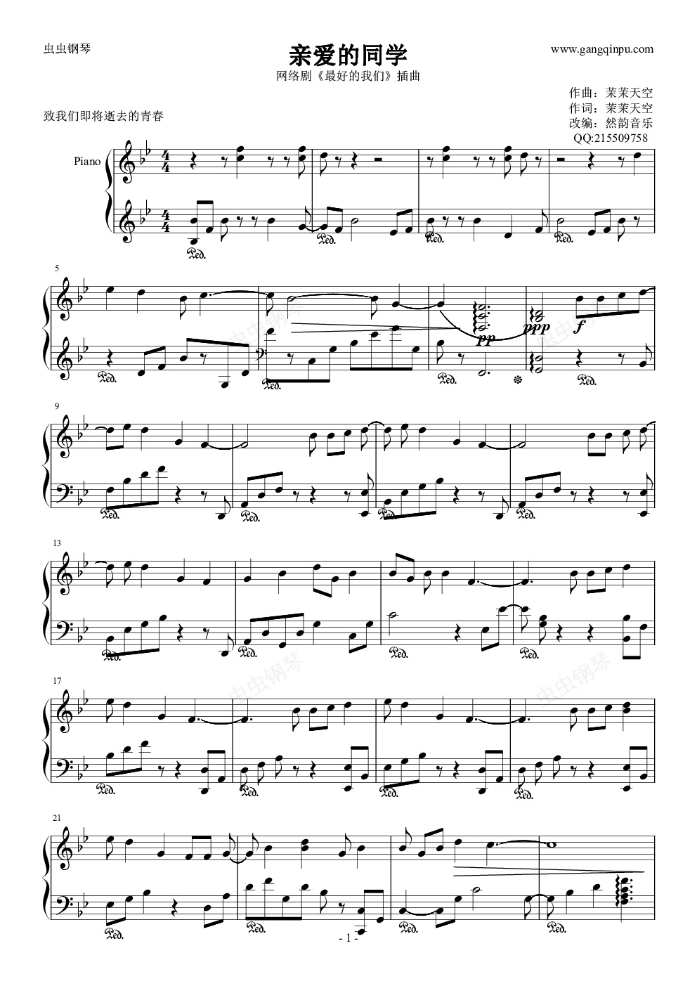 [IMG]/pu/2017/1/17/__3566__[/IMG]网剧《最好的我们》带我们重回青春时光,虽半年已逝,但这首歌带给我们深刻的回忆永远停留。 此版本是本歌曲第一个钢琴谱版本,之所以现在才发布,是因为我还是一名学生,平时很少有时间制谱。当然,若您对本谱有何修改或建议,可以加Q相互讨论。 演奏建议:本歌曲加不加踏板依照个人喜好或感觉。 仅以这首歌献给我们即将逝去的青春……