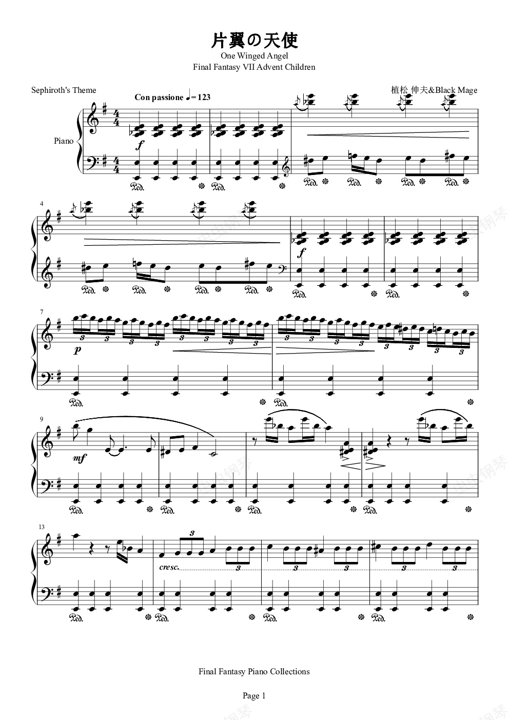 萨菲罗斯,1979年出生,是《最终幻想VII》中的终极大反派。在该系列游戏当中是主要反派,由角色设计师野村哲也构思和设计。作为游戏主角克劳德所面对的反派,在《最终幻想VII》由日本演员森川智之和英语的兰斯·贝斯配音,在《王国之心》和他的所有后续出场皆为乔治·纽伯恩。  萨菲罗斯早先是来自大型企业神罗公司的实验成果,当他还是一个胎儿时就被注射了生物细胞。在发现这一点后,该人决定要随着他自认的命运,打算控制星球,而克劳德和其他游戏主角们则试图阻止他。  作为《最终幻想》系列故事中的角色背景,是在《最终幻想VII》补完计划中揭露的。此外,他还在《王国之心》系列,和其他开发的其他游戏中,作为Boss出场。  萨菲罗斯至今已经在电子游戏界中广受欢迎,并被排在电子游戏恶棍和许多《最终幻想》系列人物名单的最高位。后来被誉为最大的英雄。  《片翼天使》是2005年CG动画电影《最终幻想VII降临之子》中的音乐原声曲之一,充满热血的一首歌。由日本著名音乐家植松伸夫以及其专属乐队“黑魔骑士”演奏,野村哲也作词,植松伸夫作曲。歌词语言为拉丁语。而且在《最终幻想VII降临之子》中,克劳德称萨菲罗斯之死纯属谣言,可见正因萨菲罗斯在电子游戏界广受欢迎。
