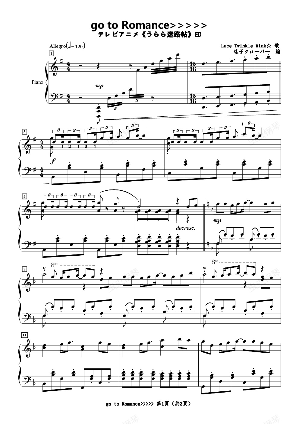 钢琴谱:【乌菈菈迷路帖ED】go to Romance>>>>>