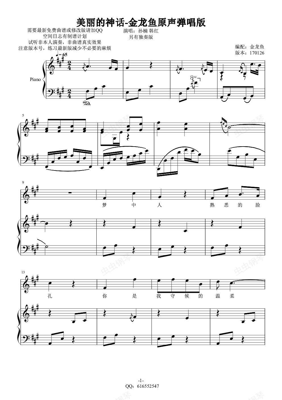 钢琴谱:美丽的神话-金龙鱼原声弹唱版170130