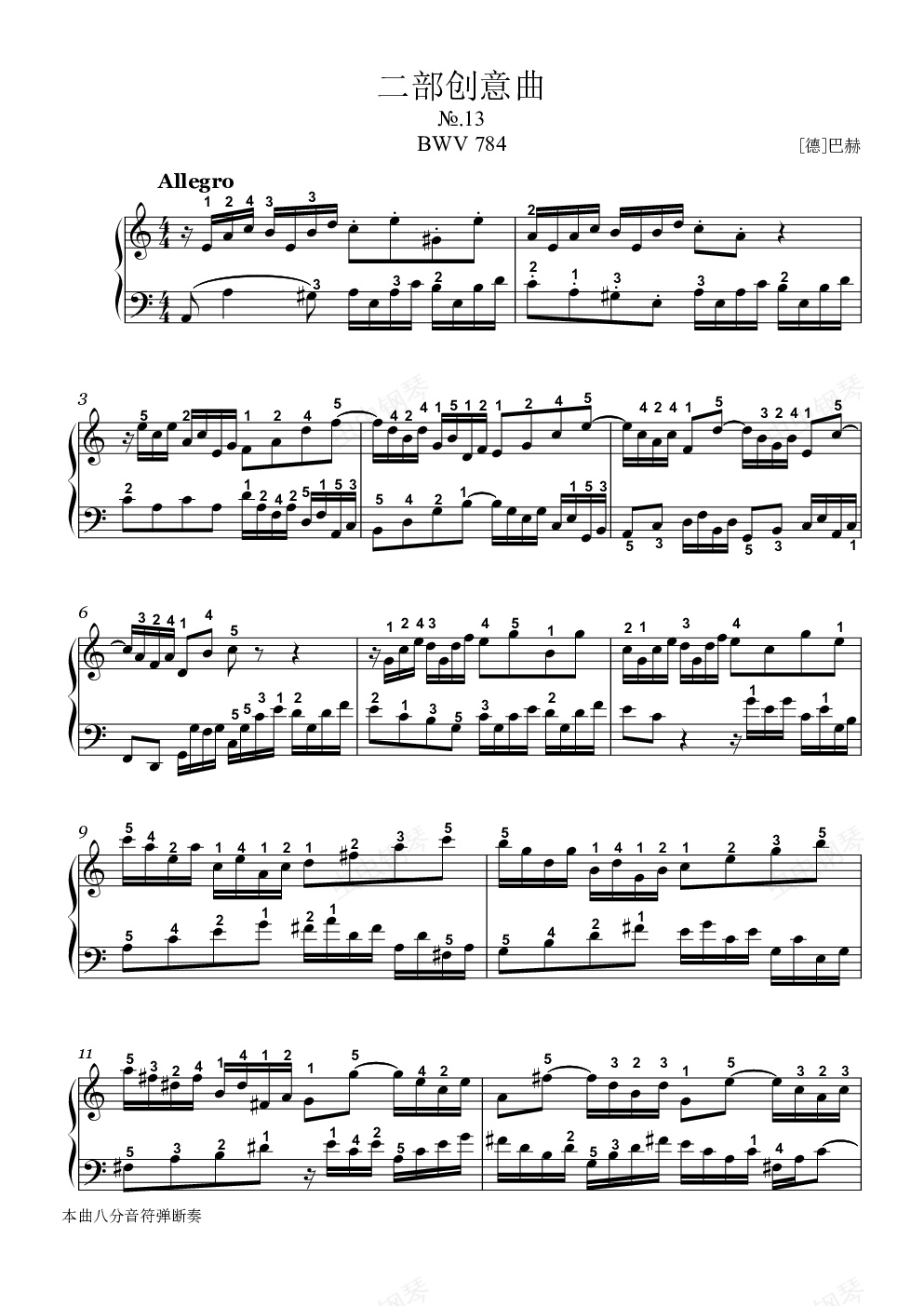 钢琴谱:巴赫-二部创意曲-13-bwv784-详细指法