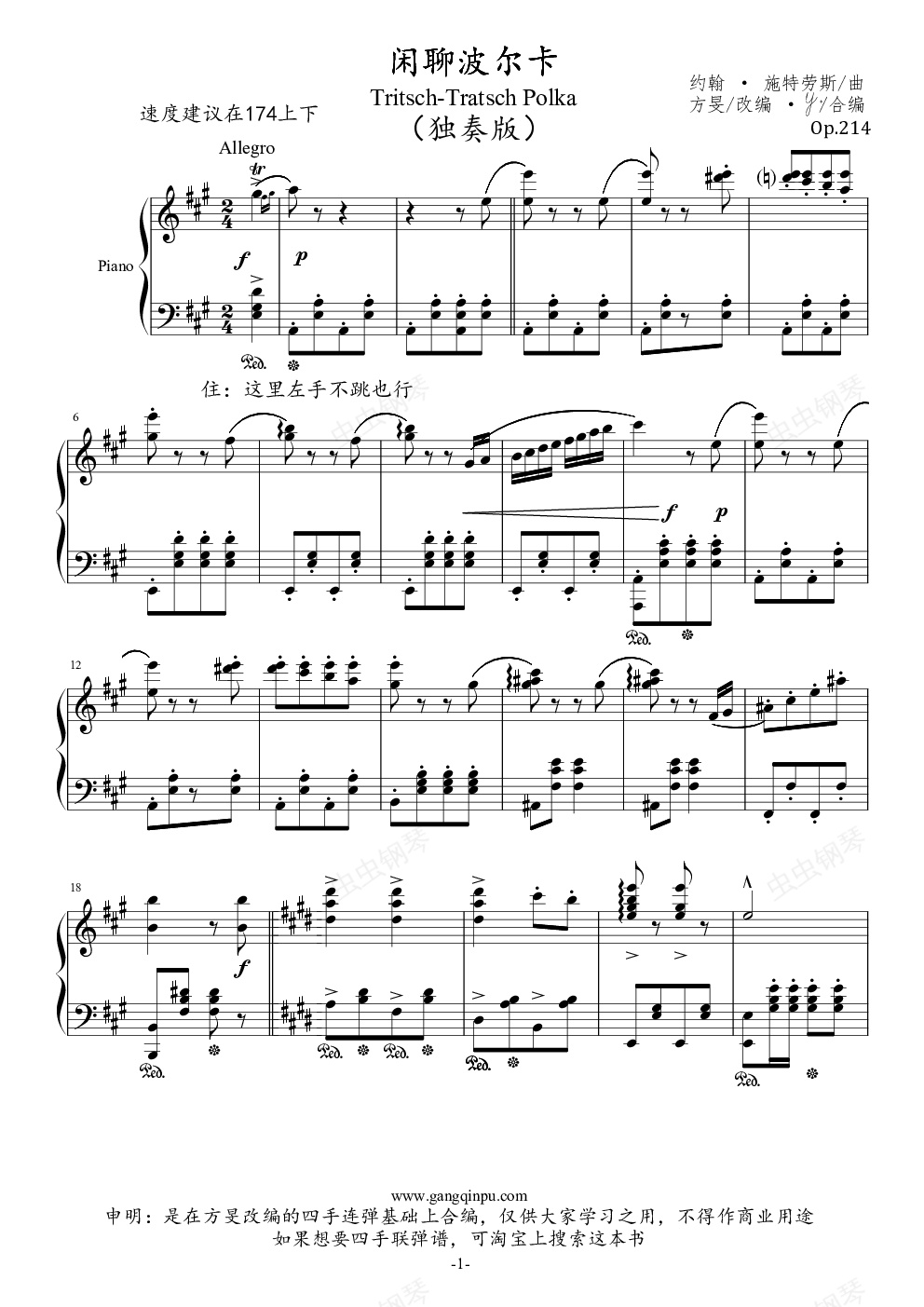 【管理】 1.麻烦管理员将我上传的试听1作为app的试听 2.麻烦管理员将我上传的pdf作为谱面,pdf可以将底色设为透明色,不是更符合本站的风格吗? 【必读】 1.此曲目是在方旻改编的四手连弹基础上合编,仅供大家学习之用,如果想要四手联弹谱,可淘宝上搜索这本书 2.我在音源上下了很大功夫,但是软件的原因,延音方面有问题 3.左手不一定要跳,我的老师建议我左手要跳,演奏时自行决定 4.亲测可弹 【其他】 1.试听一为原谱MIDI 2.试听二为中国国家交响乐团演奏的