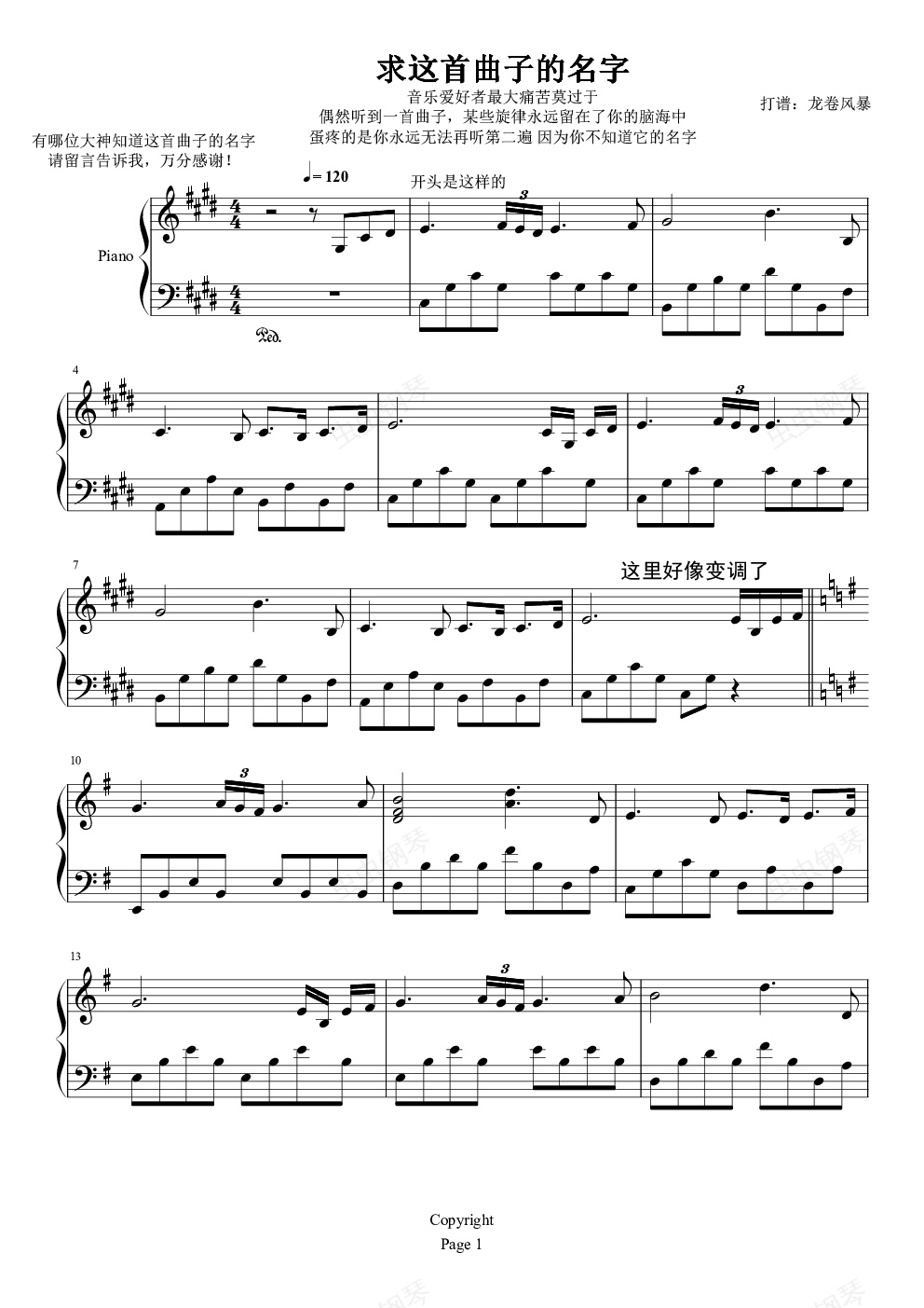 这一首曲子我一直记着,但不知道名字 当时是在某狗里无意中找到这首曲子,上面标注是 作者:贝多芬,名字:悲怆第三章 。。。 贝你毛线啊!悲怆你个头啊!就不能好好把歌名给我写上吗,这样我也就不用费这么大劲找这首曲子了 —————————————————————————— 所以现在我就来求助虫钢各路大神了 我根据残存的记忆把这首曲子的一部分扒了下来,希望知道这首曲子名字的大神在留言里告诉我 或者知道类似风格的作曲家也请告诉我 非常感谢!!! 2017.2.7 龙卷风暴 ————————————————————————— 我所理解的音乐爱好者最大的痛苦莫过于,当一首曲子的某一段旋律无意中烙在你的脑海里,挥之不去,你却永远没有听第二遍的机会,因为你不知道它的名字,尤其是在这首曲子足够小众的情况下