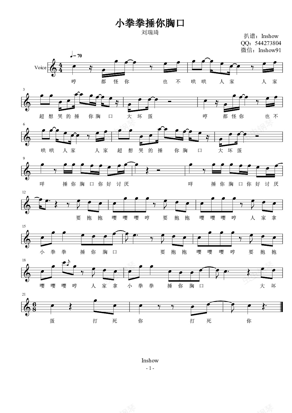 钢琴谱:刘瑞琦 - 小拳拳捶你胸口【欣赏版】