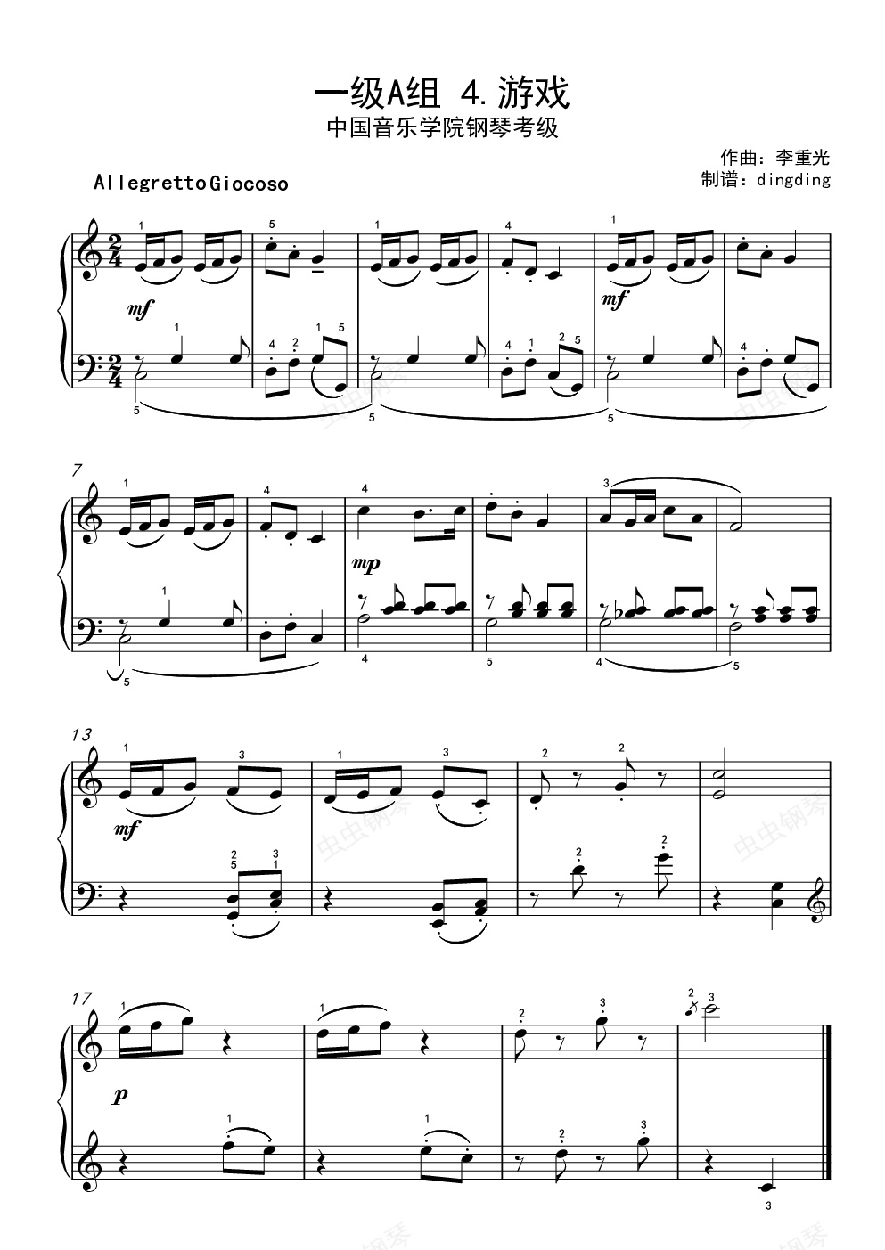 钢琴谱:中国音乐学院考级 一级A组 4.游戏