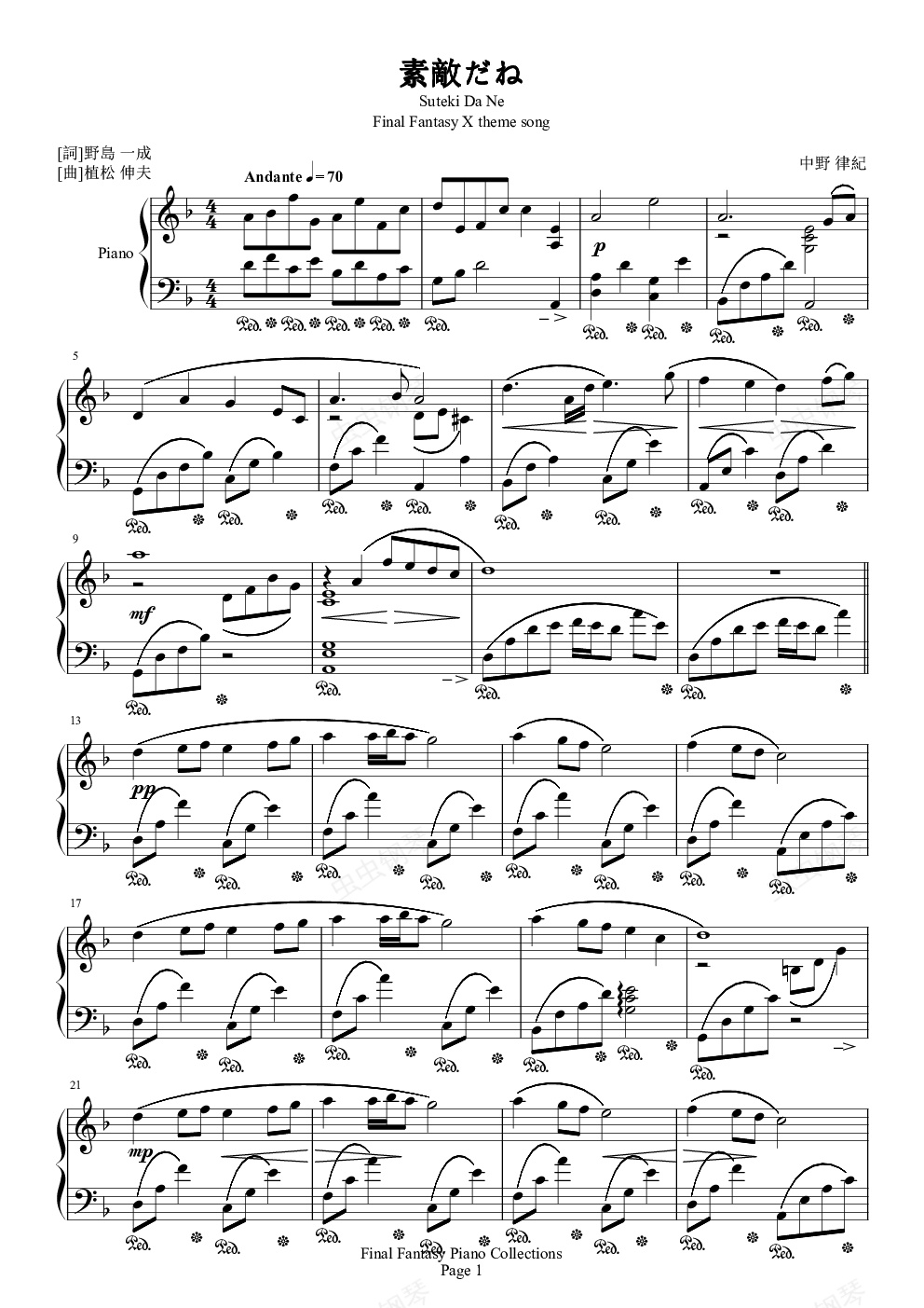 素敵だね,日语为“好棒”、“完美”和“优秀”的意思,日本著名的游戏业霸主公司出品的当家巨作《最终幻想X》的主题曲,2001年发行。由野岛一成作词,植松伸夫作曲,中野律纪演唱。全曲以高亢、嘹亮和包含温柔的嗓音唱遍了世界各地,至今已成为日本名曲之一。此外在网上此歌曲还有李秀英翻唱的韩文版。还有钢琴版和吉他版。
