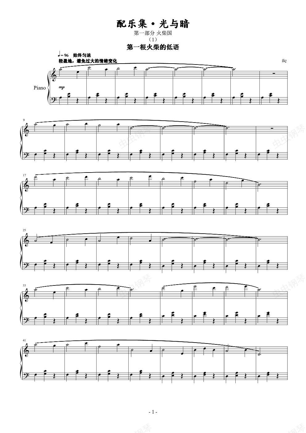 新写的纯钢琴配乐集《光与暗》,此配乐集为童话故事而作,与上一作《长发公主》有较为密切的联系,所以曲子中有一些使用了之前的动机、甚至原曲(当然肯定没有偷工减料~)。 本曲集包含三个部分:《火柴国》、《黑童话三章》和《暗面》,《火柴国》描写的是《卖火柴的小女孩》中小女孩点燃四根火柴的故事,不过有自己的拓展;《黑童话三章》描写的分别是《彼得潘》、《阿里巴巴和四十大盗》以及《丑小鸭》,但是都是以另一种视角写作;《暗面》则融合了《侏儒怪》、《匹诺曹》、《糖果屋》、《爱丽丝梦游仙境》、《睡美人》以及《莴苣》等童话故事,并结合了些许东西方神话的内容。 曲集试听全部加在一起有一个多小时,压成wma格式的话传不上来,MP3则太大,所以直接发曲集下载链接吧:/s/1,当然发布后也会试着联系管理员尽量上传完整试听的,曲谱页数比较多,管理员辛苦了~