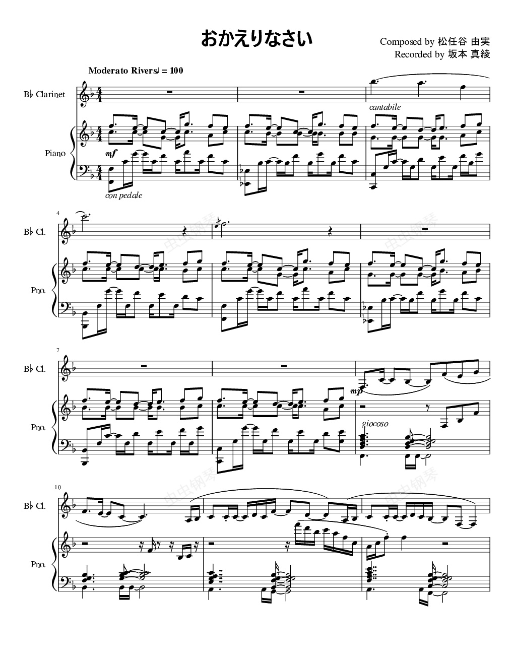 钢琴谱:『单簧管』「玉响」OP 「おかえりなさい」