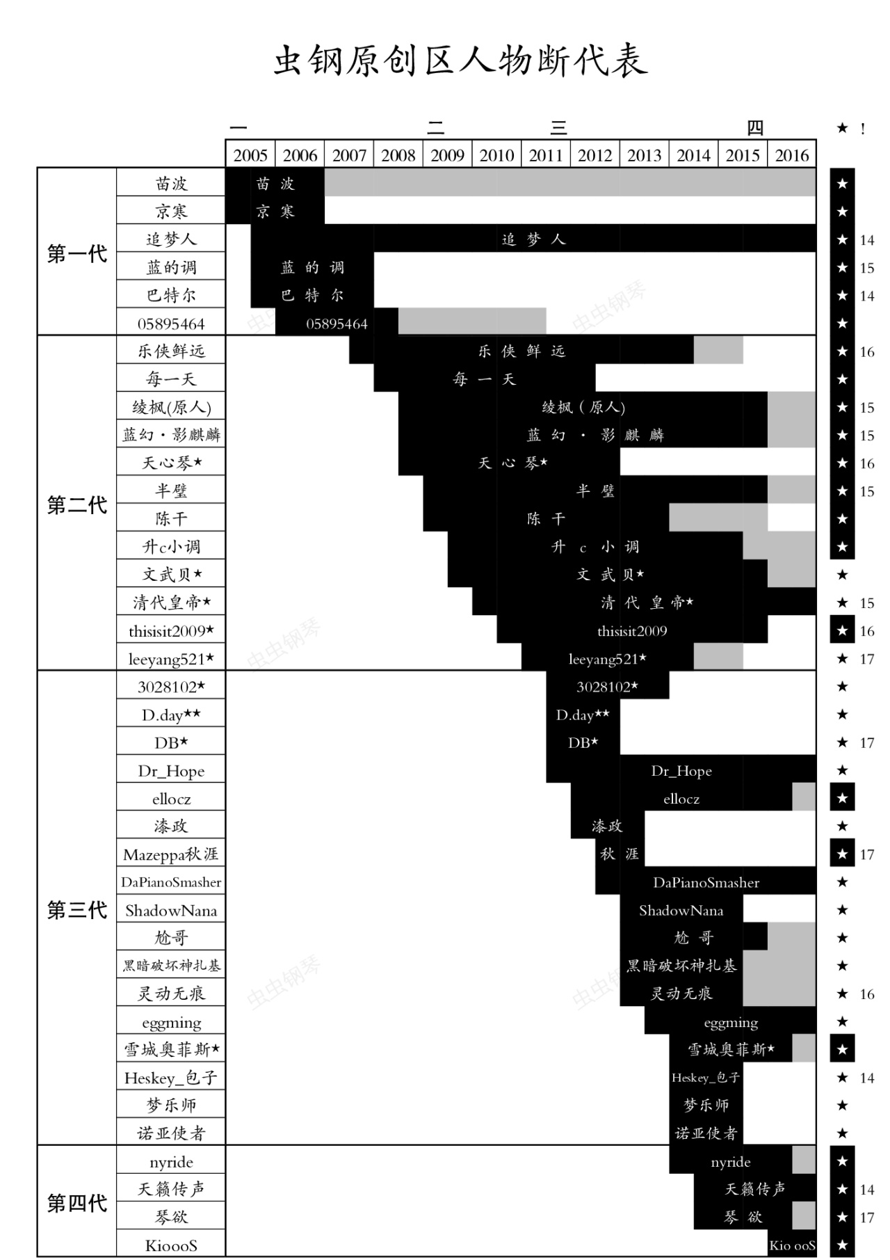 与《虫钢原创区简史》配套的资料表。其中各种!号、★号的意义,已经在《虫钢原创区简史》的附录三中解释清楚,不赘。 - 这份记载截止在2016年8月,一共28页。试听音乐为虫虫钢琴原创区的站歌《虫虫之歌》,其歌词含义在《虫钢原创区简史》的27页结语中做了分析。