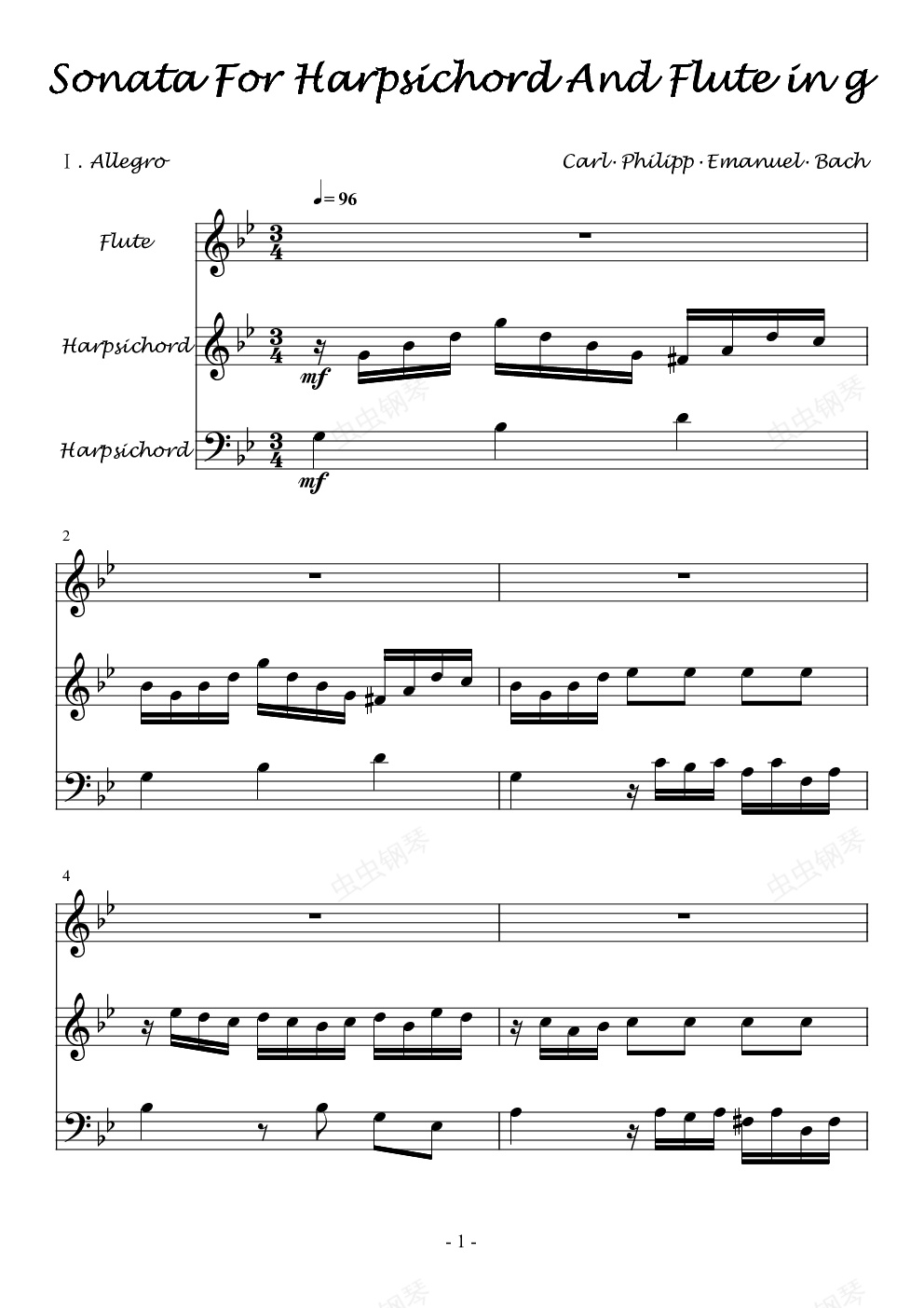 钢琴谱:长笛与羽管键琴奏鸣曲 第一乐章