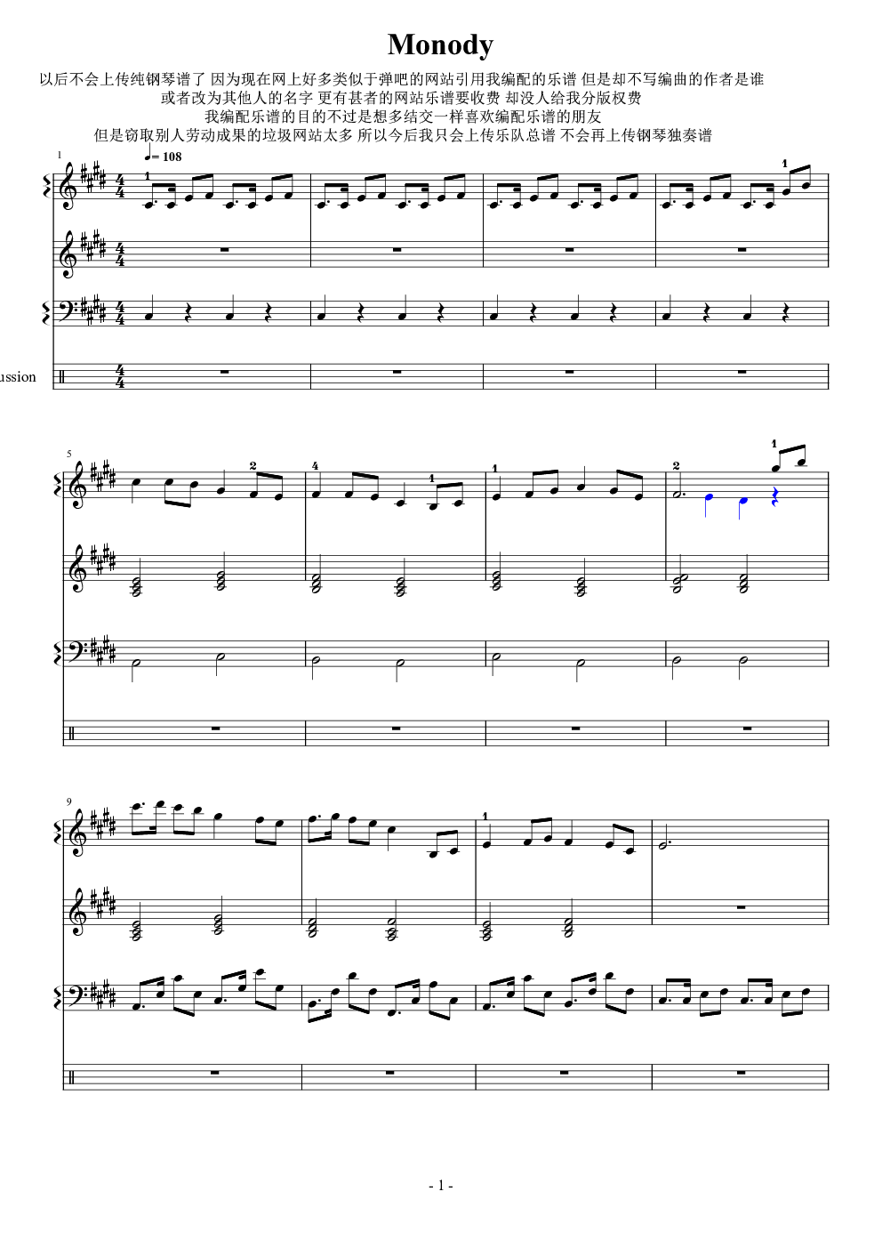 以后不会上传纯钢琴谱了 因为现在网上好多类似于弹吧的网站引用我编配的乐谱 但是却不写编曲的作者是谁 或者更改为他人的名字 更有甚者的网站乐谱要收费 却没人给我分版权费 我编配乐谱的目的不过是想多结交一样喜欢编配乐谱的朋友 但是窃取别人劳动成果的垃圾网站太多 所以今后我只会上传乐队总谱 不会再上传钢琴独奏谱!