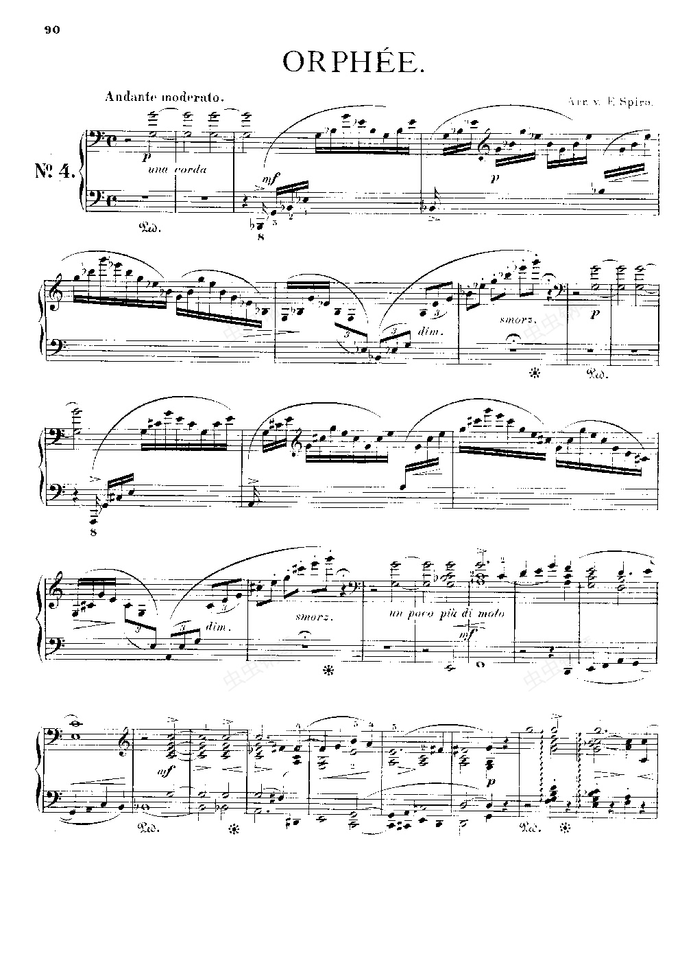 李斯特 第四交响诗 奥菲欧 S.98(钢琴独奏版作品编号:S.511b)。在这首交响诗里李斯特采用了家喻户晓的古希腊神话作为题材。在李斯特的十三首交响诗中,这是最短的一首,只有十分钟左右。而且它也没有很多的戏剧性,没有强烈的冲突。实际上,它是一首赞美音乐艺术、赞美必将战胜死亡和黑暗世界的光明的抒情诗。这是在李斯特心中占主导地位的思想,贯穿了他的一生。从配器角度来观察,这部作品比较细腻,乐器常以独奏方式出现,因此带有室内乐风格。在十九世纪末的印象主义大师德彪西笔下,这是常见的手法,可以说,李斯特在《奥菲欧》的创作中是有着某种属于印象主义的音乐思维的,与他的其他交响诗作品相比,它更贴近大自然,更追求纯粹的美感。