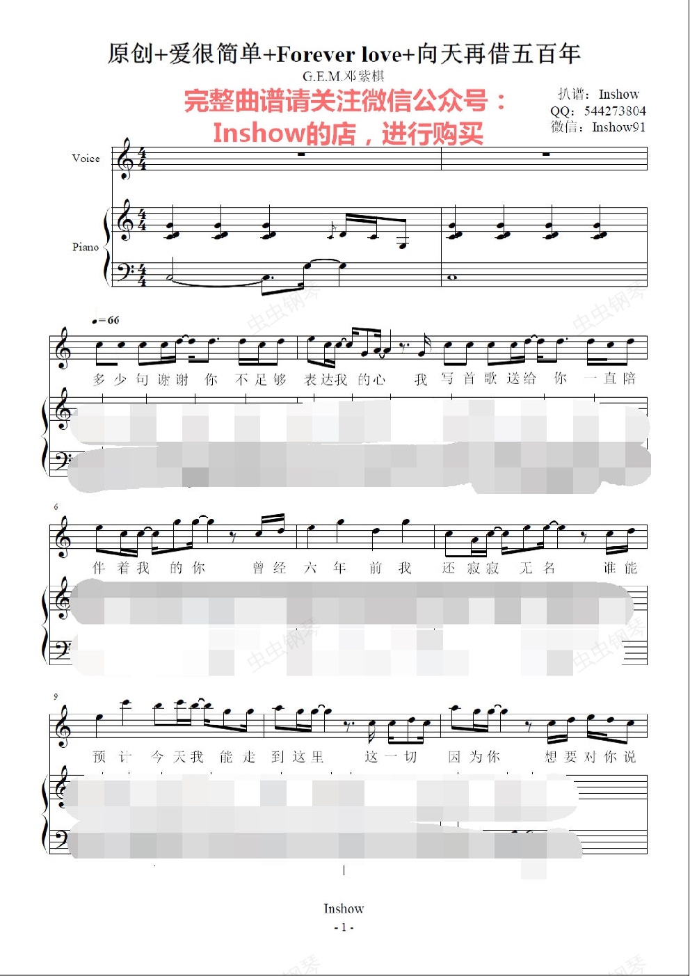 钢琴谱:邓紫棋 -原创+爱很简单+Forever love+向天再借五百年