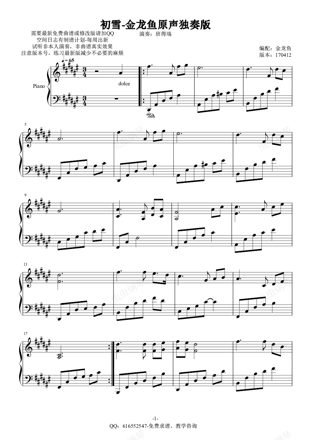 钢琴谱:初雪-班得瑞-金龙鱼原声独奏版170412