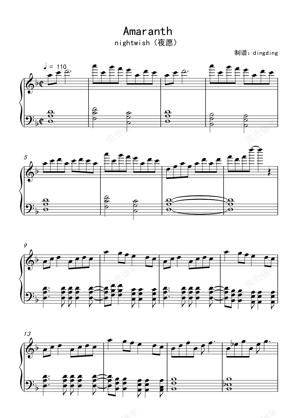 钢琴谱:Amaranth 夜愿nightwish