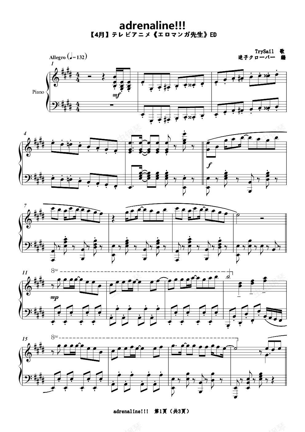 钢琴谱:【埃罗芒阿老师 ED】adrenaline!!!
