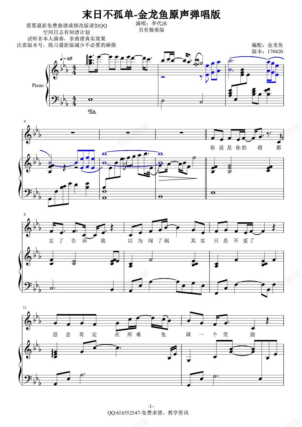 版本说明 特别声明:本人放出的所有钢琴谱均完整上传至曲谱分享网站,并定时更新,不以琴谱做任何牟利(除本人原创音乐以外) 编写曲谱和完整放出的目的是为了同广大琴友学习交流钢琴演奏、音乐理论等问题…… 对此伴奏谱有:转调、简化、速成等需求的请加 免费扒谱编配请加QQ,人多需要排队,但不会收费 放出的伴奏谱中有本人弹奏时为了方便自己弹奏或者为达到更好个人弹奏效果而做改动, 具体求谱、写谱、谱面等问题的详细说明请参考QQ空间日志 放出为大家分享,金龙鱼所有曲谱(除原创)不用作商业用途,仅供大家弹奏时参考用, 固定每周出新 再次特别声明,本人放出只是为了交流学习,觉悟他求!从求谱到制谱发布中间没拿过一分钱,希望别有用心之人看清楚 。。。。。。以后的修改版都会在QQ放出版本修改的具体内容,欢迎大家查阅 设置版本号以及不停的改版给大家的练习带来烦恼,本人对此表示抱歉 但是,人都是在不停学习进步的,随着学习和实践的深入,我对我以前的谱子会有新的想法,以前谱中出现的错误得以在知识丰满后修正,这是对所有人的尊重, 希望大家谅解,这么做的目的也是源于本人放谱的目的:为了学习交流,为了促使自己的进步