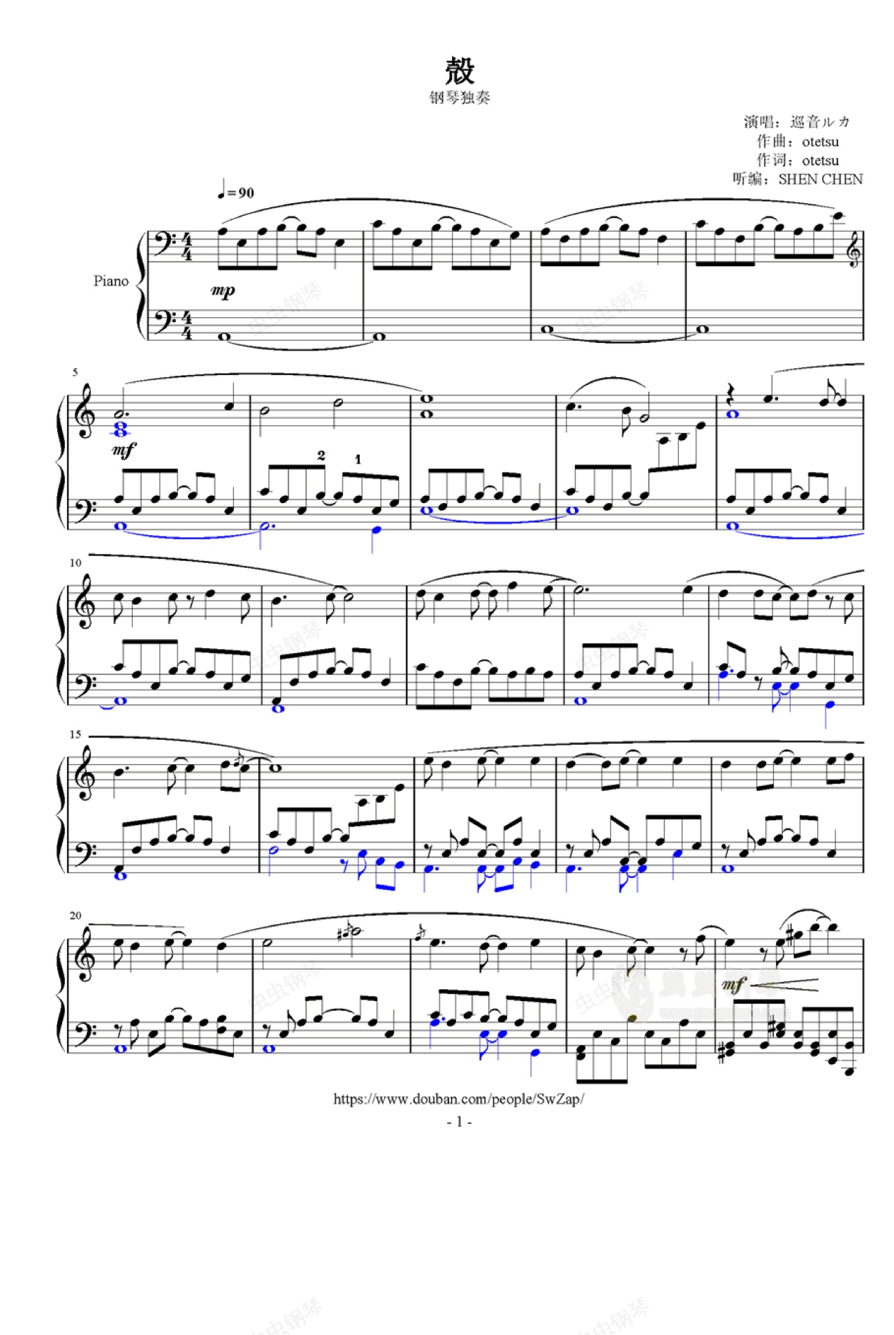PDF下载:/lpost/1演奏视频: 电钢琴:/video// 立式钢琴:/video//关于这首曲子 是制作了巡音第一首原创曲(同时也是第一首殿堂曲)《星屑ユートピア》的作者。相比于他的那首成名曲,这首《殼》可以说是他比较冷门的一首曲子,却成为了本人的V家入坑曲,让我产生了“某些曲子相比于让真人演唱,让演唱出来可能更有魅力”的看法。之前认为像《甩葱歌》之类大红的V家曲只是一种恶搞罢了,所以当时其实挺看不起V家的……这首曲子直接颠覆了我之前的想法。当时接这首曲子改编的时候其实创作水平并不太够,也一直很苦恼要怎么才能表现出后面那种震撼的感觉。(当时甚至还没入坑二次元……)之后听了A叔等人的演奏(感谢A叔一直都提供自己演奏的曲谱,我才有机会偷师他的编曲),准备了一年左右各种修改完善,最后才完成了这个改编,并且能够演奏出来(虽然弹得不是很好,估计今后还会重录 = =)。 [IFR]///?aid=[/IFR]
