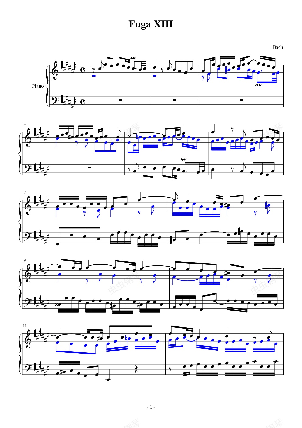 古德尔演奏,巴赫平均律第一册,第13首,升F大调赋格 (2017/5/13修改了一处曲谱错误,第17小节低声部G#改为A#,优化谱面) (2017/5/14修改了三处曲谱错误,第19—20小节的连音线,25、26小节的E#改为E,29小节中声部E#改为E,优化谱面。) (2017/5/15添加了管风琴演奏音频)