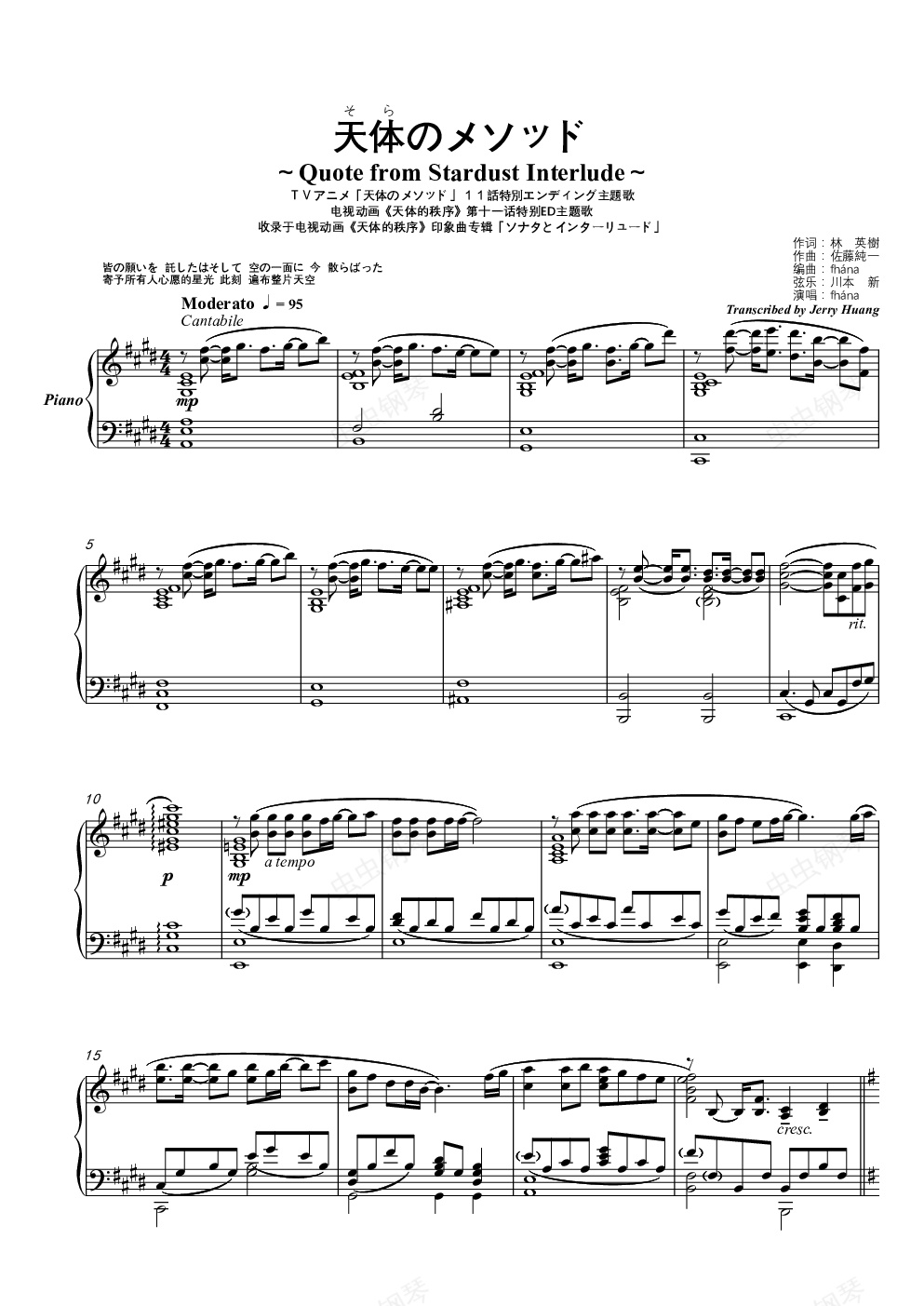 [IMG]/pu/2017/5/15/__3416_18145_[/IMG] 写在前面:这首歌听完之后大家应该也能明白,这首曲子的主旋律来源于那首《天体的秩序》的神ED《星屑のインタールード》,可以认为是后者的钢琴和弦乐编配的版本。话说回来我不是很擅长编慢速曲(虽说我和舍友说这是“慢速曲”的时候被狠狠地嘲讽了一番),虽然尽了最大努力,但因为不是很懂慢速曲左手如何编,所以左手可能有人会觉得单调吧。不过,在做这首曲子之前我分析过曲子的和声进行,左右手的和声是严格按照原曲来的,所以和声上应该没有太大问题。各位dalao有各种不满和意见请随意提出,我已经做好被喷一脸的觉悟了(认真脸)。这首曲子是电视动画《天体的秩序》第十一话ED,由组合fhána作词、作曲、编曲和演唱,收录于《天体的秩序》印象曲专辑《ソナタとインターリュード》 (《奏鸣曲和间奏曲》( and))。说起来第一次注意到fhána是在《小林家的龙女仆》OP《青空のラプソディ》,之后就瞬间路转粉,不仅开始寻找fhána的早期作品,而且开始疯狂搜刮fhána的专辑,现在手上算是有了《青空のラプソディ》和《星屑のインタールード》(《天体的秩序》ED)的动画盘CD,后者还是(从别人手上低价拿到的)未拆封的、封入fhána一单的先行购入券的限量版CD,算是相当稀有的存在。说到fhána的话,个人十分喜欢这个组合的曲子的和声特征以及主唱清澈的声线,以及曲子里犹如灵魂和支柱一般存在的弦乐编配,无论是《青空のラプソディ》,还是《星屑のインタールード》,弦乐团的加入都是神来之笔,能给人一种波澜壮阔的感觉。演奏建议:还是那句话,如果左手能应付大量音群跑动和跳跃演奏不按错音,那这首曲子就没有难度。如果觉得有难度的话,可以试试删去左手低八度音。当然,如果觉得这个版本太(bu)过(gou)简(gui)单(chu),可以点下面的链接看油管大神对ED的鬼畜编配:/video//。专辑封面: [IMG]/pu/2017/5/15/__3416_18158_[/IMG]