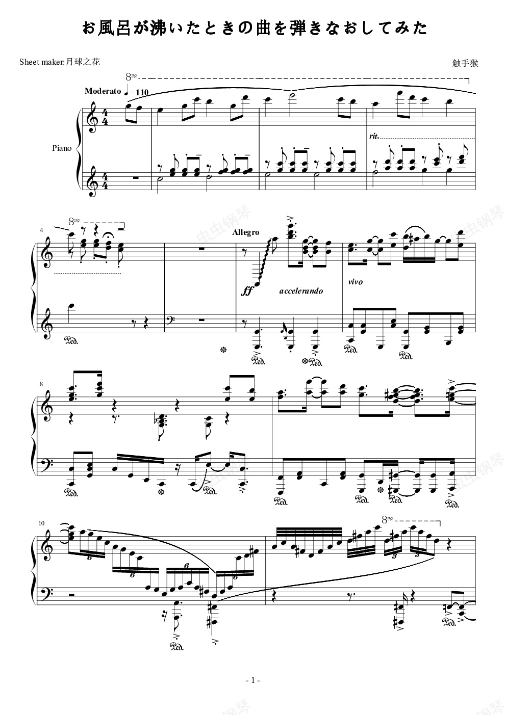 钢琴谱:触手猴 お風呂が沸いたときの曲を弾きなおしてみた