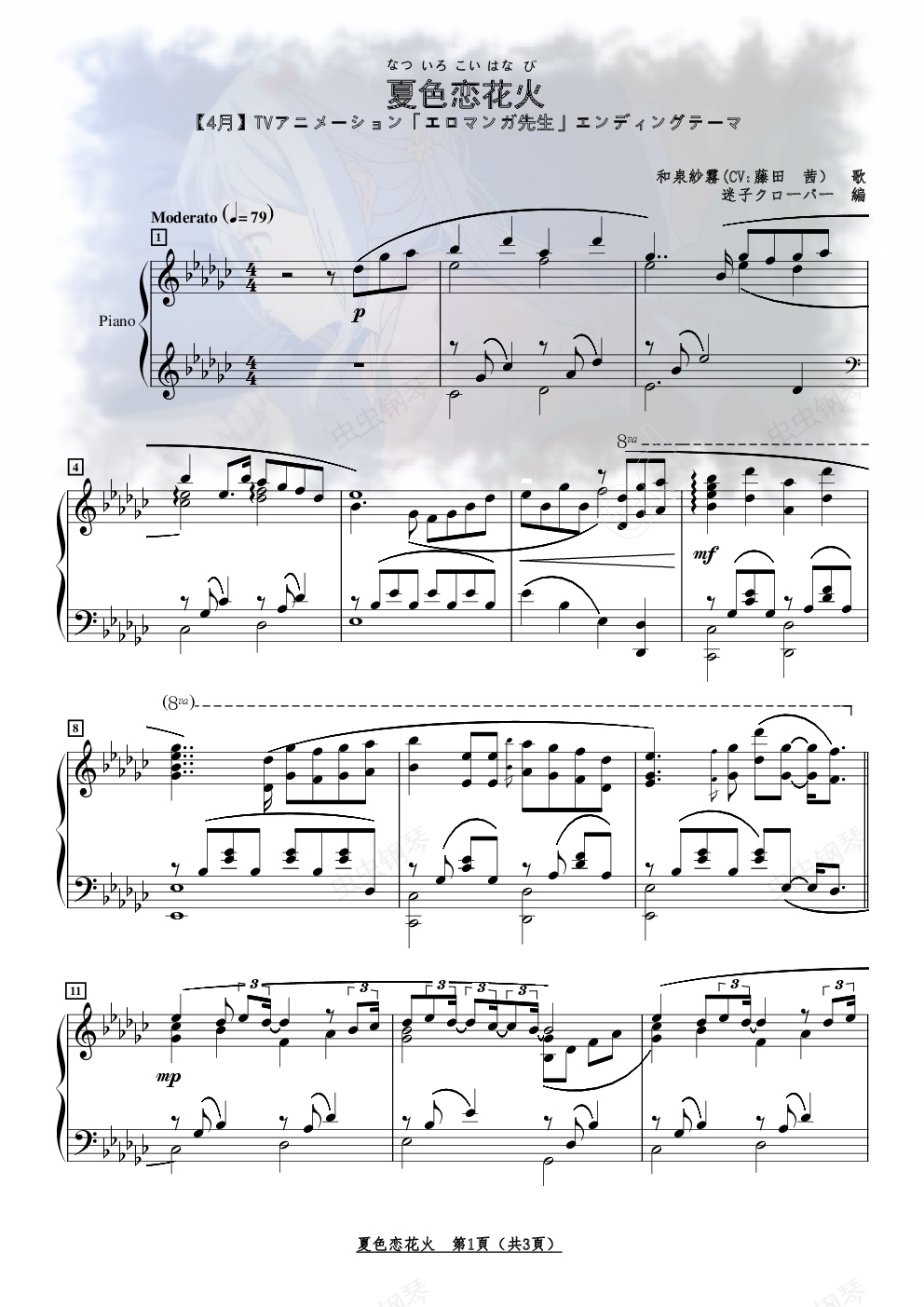 [IMG]/pu/2017/5/29/__5257_1496_[/IMG]我也试着做了下PDF版本,感觉相当地不错。这首曲子出自《埃罗芒阿老师》第八话片尾曲,开始还以为完结了呢,不过转念一想这怎么可能呢,大多数日本动漫不都是以12,24话的吗?所以只是虚惊一场...==================================================图片链接:///88443/