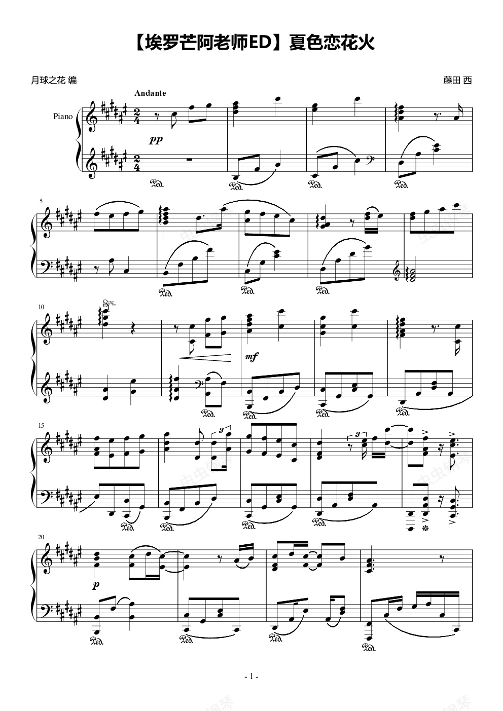 [IMG]/pu/2017/5/29/__535__[/IMG]原本打算做OP彩蛋的,不过发现了新ED就先抓紧时间编了。-------------由于这是一首慢歌,所以我在速度上稍微比原曲快了一点,增强还原。这首歌原本是swing节奏的,因为某些原因,我还是将它编成普通节奏,适当地在某些地方变用三连音。还有要说的是,第36-43小节使用了七和弦九和弦和半音过渡,是想给人一种“咖啡馆”的感觉。第49-50小节第二声部高低八度切换的处理加上第50小节的十六分音符三连音,本意是想让听者“不知道怎么回事”产生紧张感。这首歌结束时原本是以四级和弦结束的,这样结束我觉得在某种程度上还不够完美,所以我在最后以四度叠置的形式结束制造不协和,给听者一种意外感。