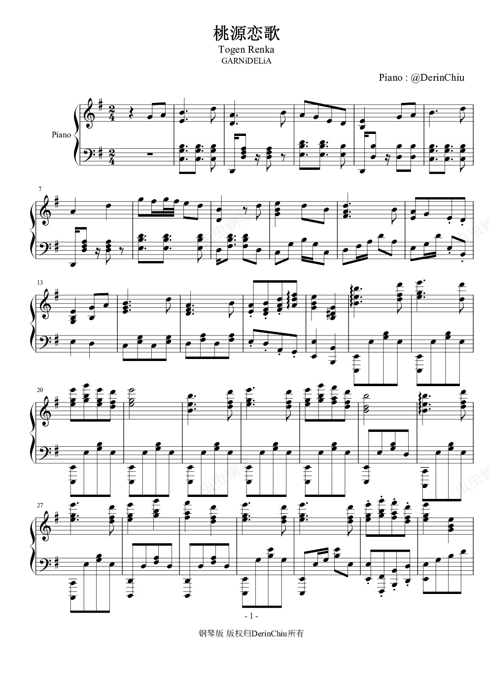 钢琴谱:桃源恋歌(Togen Renka)