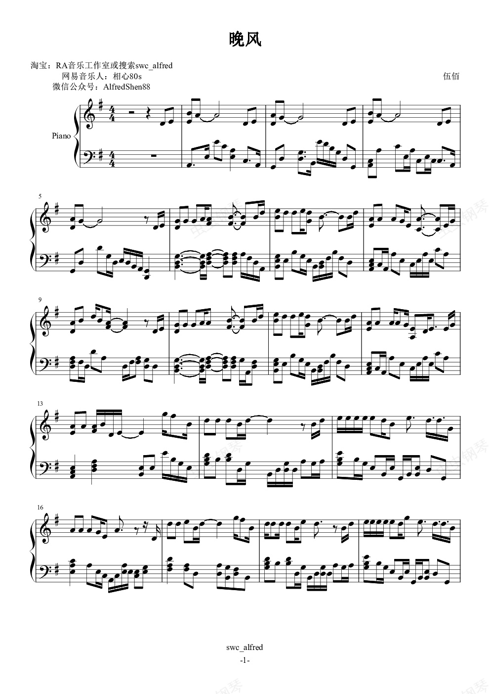 钢琴谱:晚风