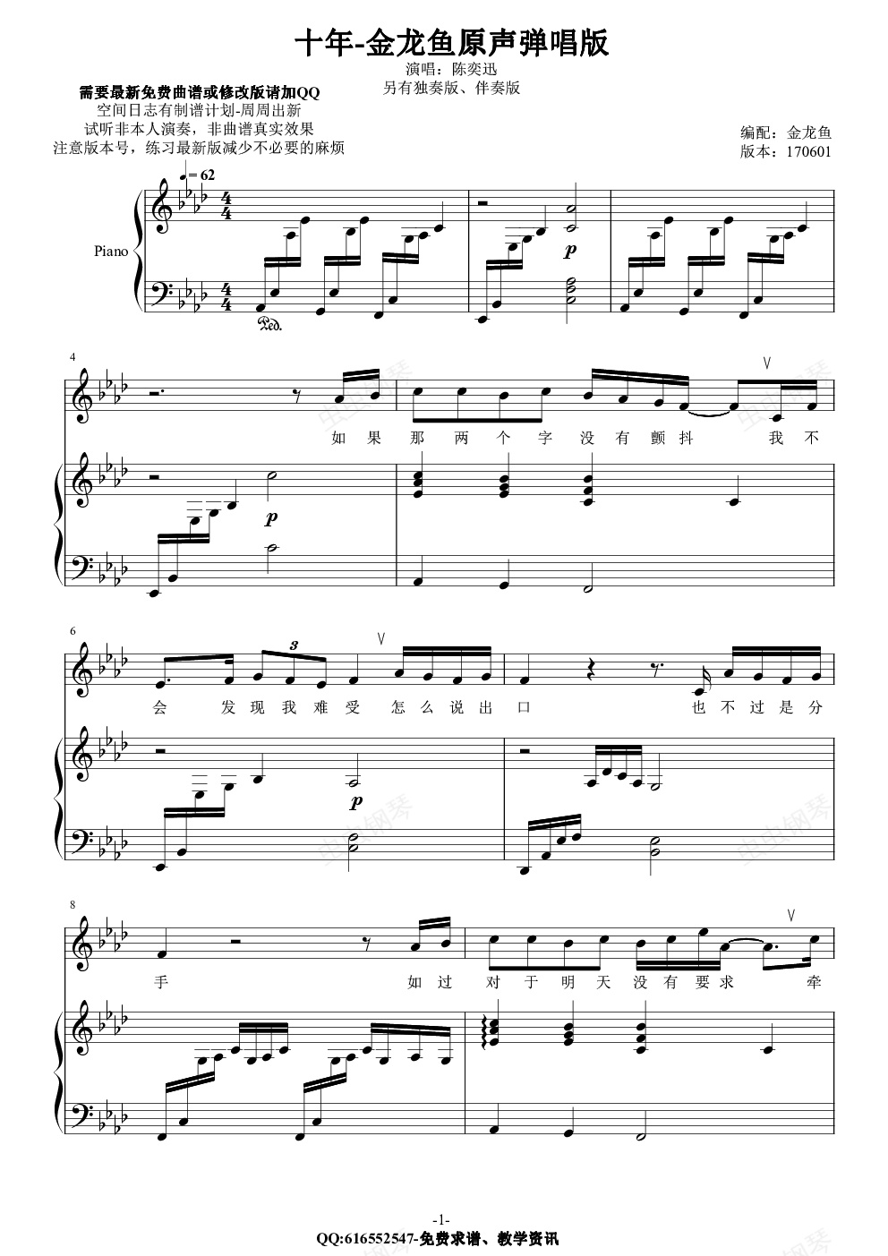 钢琴谱:十年-金龙鱼原声弹唱版170601