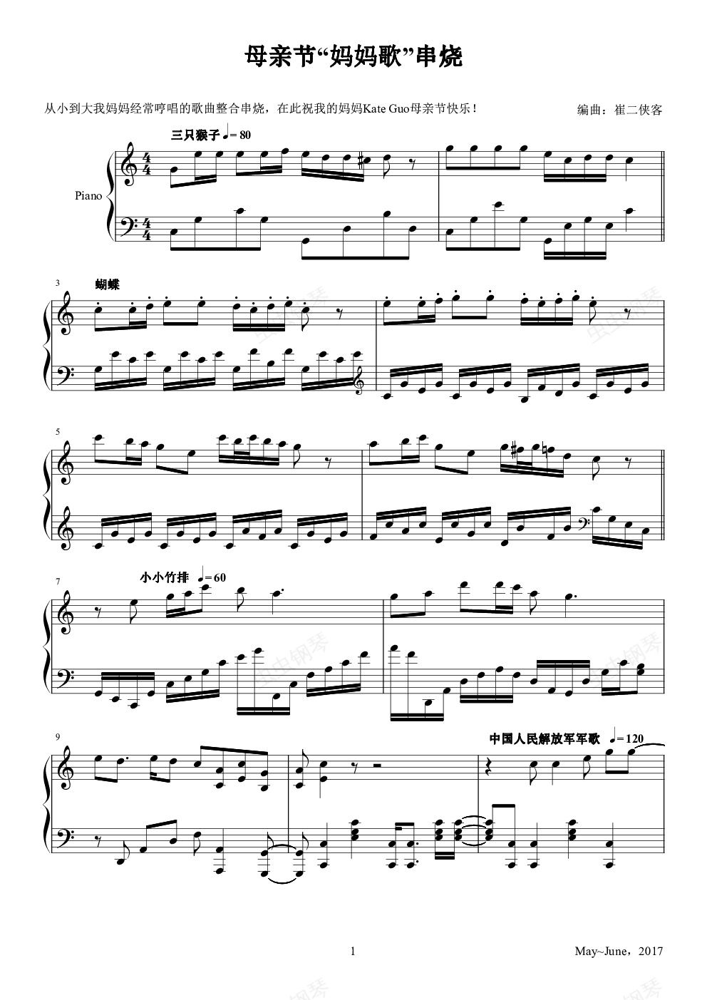 重要说明:向以上经典曲目原作者致敬! 在以上串烧之中,《红旗颂》前奏部分选自古筝钢琴合奏曲《临安遗恨》中片段。林吉良作,何占豪改编。 最后结尾国歌部分非本人编配,选自虫虫钢琴网,由琴友上传。 特此说明。 本串烧速度节奏多变,强弱及踏板未明确标注,因为这些都是经典怀旧金曲,请琴友们凭感觉自行弹奏。 本串烧中歌曲数目众多而又极度浓缩,望大家能够自由切换风格,即兴一些过渡也是极好的。 [IMG]/pu/2017/6/13/__8215_43744_[/IMG] 关于迟到的母亲节礼物问题:本人现在加拿大留学,母亲节没能回家为妈妈送祝福,只好将这些妈妈喜爱的歌曲写成钢琴串烧,六月底回家为妈妈弹奏。妈妈最爱哼唱歌曲,从小到大,妈妈都是一边忙碌干活,一边嘴里哼着歌曲。音乐和这些经典金曲在我幼小的心中扎下了根。十年铸剑,如今总算能将这些弹出来写下来,倍感欣慰。 这些歌曲花了一个多月。一边上学,一边练琴,还有准备年终考试以及小型演出等繁琐的事,与此同时,像一只小蜗牛一般将母亲节歌曲钢琴改编缓缓行进着…… 本串烧包含很多歌曲,每首歌曲都简简单单一小段,虽每段之短,让人听得戛然而止意犹未尽,我却恨不得再写多一些歌曲,因为妈妈哼过唱过的歌曲实在是好多好多呀……感谢妈妈为我开启生命之门,并领我走上音乐之路。 再次祝我亲爱的妈妈Kate Guo节日快乐! (包含曲目:《三只猴子》《蝴蝶》《小小竹排》《中国人民解放军军歌》《可爱的一朵玫瑰花》《呼伦贝尔大草原》《渔光曲》《老两口学毛选》《翻身农奴把歌唱》《我的祖国》《黄水谣》《茉莉花》《鸿雁》《新贵妃醉酒》《红旗颂》《吃水不忘挖井人》《歌唱祖国》《义勇军进行曲》)