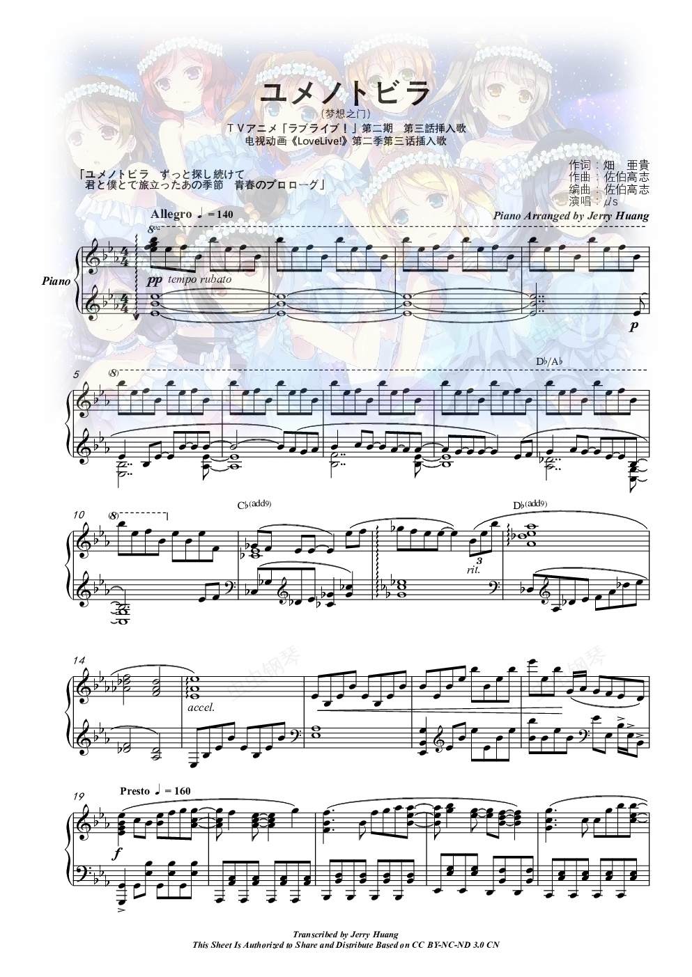 [IMG]/pu/2017/6/27/__421_03619_[/IMG]———————————————————————————————————————————————————————————— 如果管理员大大能看到这段话,就麻烦把按照上传的样子把乐谱背景做成白色的吧~这首《ユメノトビラ》是电视动画《!》第二季第三话的插入歌,同时在动画《!!!》中有樱内梨子的弹唱版本,手游《!学园偶像祭》官方译名为《梦想之门》,由佐伯高志作曲、编曲,由畑亚贵作词。这首编配基本上是个人积累的所有编曲以及和声积累的总结,期间感谢月球之花dalao的帮助和建议。乐曲Intro、和Outro部分进行了些许魔改,有一些自己的理解。左手织部部分参考了A叔的《Extra Magic Hour》(因为这两首实在是太像了www)、《吹雪》、《Snow》还有触手猴的左手十度大跳,所以整体难度大致相当于《Extra Magic Hour》,如果觉得难的话,删去二声部以及将左手换成八度交替会好很多,同时如果对临时降记号和还原记号头疼的话,乐谱上标注的和弦记号也许会有帮助。———————————————————————————————————————————————————————————— 其实个人还是觉得改编的时候乐段之间的某些衔接并不是很顺畅,加上的装饰性乐句有些感觉画蛇添足,但是如果不加的话又会很重复枯燥...而且最重要的是,乐曲最后其实结束在「青春のプロローグ」那里就挺好,但是想来想去还是加上最后的配器伴奏的一段,主要是怕LLer吐槽渣技术,删了之后又没改好这种......所以总而言之还请米娜桑随意吐槽就好......———————————————————————————————————————————————————————————— 关于和声:其实选这一首的原因之一,是觉得这首曲子的和声部分有不少亮点,而这些亮点集中体现在副歌和乐曲后段两个副歌之间的衔接段上。首先是副歌,比较有意思的是61-63小节的Eb/Ab-Eb/Bb-Eb,功能上说三个和弦都是Eb大调上的主和弦,但的根音进行会有一种的感觉,使得连续三个Eb不至于让人觉得无聊。从Ab这个4音开始的和声进行功能类似于从四级和弦开始的和声进行,有一种很强的张力感,或是一种飞起来的感觉。Eb/Bb是Eb的第二转位,功能上虽然是Eb,但是由于根音是5音Bb,因此具有类似五级和弦的性质,有一种接到主和弦Eb的倾向和不稳定感,所以十分常见于在多个相同和弦的进行中追求变化的情况。衔接段部分,137-143小节的Ab/是一边离调一边根音半音下行的和弦进行,非常有意思,所以个人也把这段魔改成了比较激昂的感觉(笑)。当然除此之外,全曲到处都能见到借用和弦和离调手法,比如11-13小节的Cb和Db,117-118小节的Cbm和Fb,133小节的Eb7/Db等。随便一提,在魔改开头的时候,个人在第15小节用了sus4和弦,即省略3音加上4音的三和弦。众所周知,大小三度音是判断大小和弦的标准,而省略三音的和弦大小性质尚不明确,所以可以很顺利地接到目标大小和弦而又不失变化。基于此,sus2和弦和五和弦也很适合在适当时机放在目标大小和弦前。———————————————————————————————————————————————————————————— 写在最后:其实选这一首还有一个原因,因为这也是一首梦想之歌。如果有入LL坑或是看过《!》应该能会有共鸣。正如歌曲名和当中的歌词那样,众人为寻觅梦想,不断努力,由当初的一单《僕らのLIVE 君とのLIFE》惨不忍睹的发售量到天价般的初回限定版及《Music S.T.A.R.T!!》超过30000张的发售量,再到现在以85000张发售量位居第一位的二专,其间,各人不断成长和努力,九人所寻觅的梦想,应该已远远超过她们当初的期望了吧。如今,时光飞逝,个人大学四年的生活将要画上句号,就允许我为这苦乐相伴的闪光日子献上一曲。不管是已经实现了梦想的各位,还是在逐梦路上的各位,之后的日子还请继续努力,因为唯有梦想永不终止、永不完结。———————————————————————————————————————————————————————————— 觉得背景太乱、想要没有背景配图的PDF,以及试听、图片、简介都请在这里找:/s/1 更多信息,请参见萌娘百科:《梦想之门》:https: