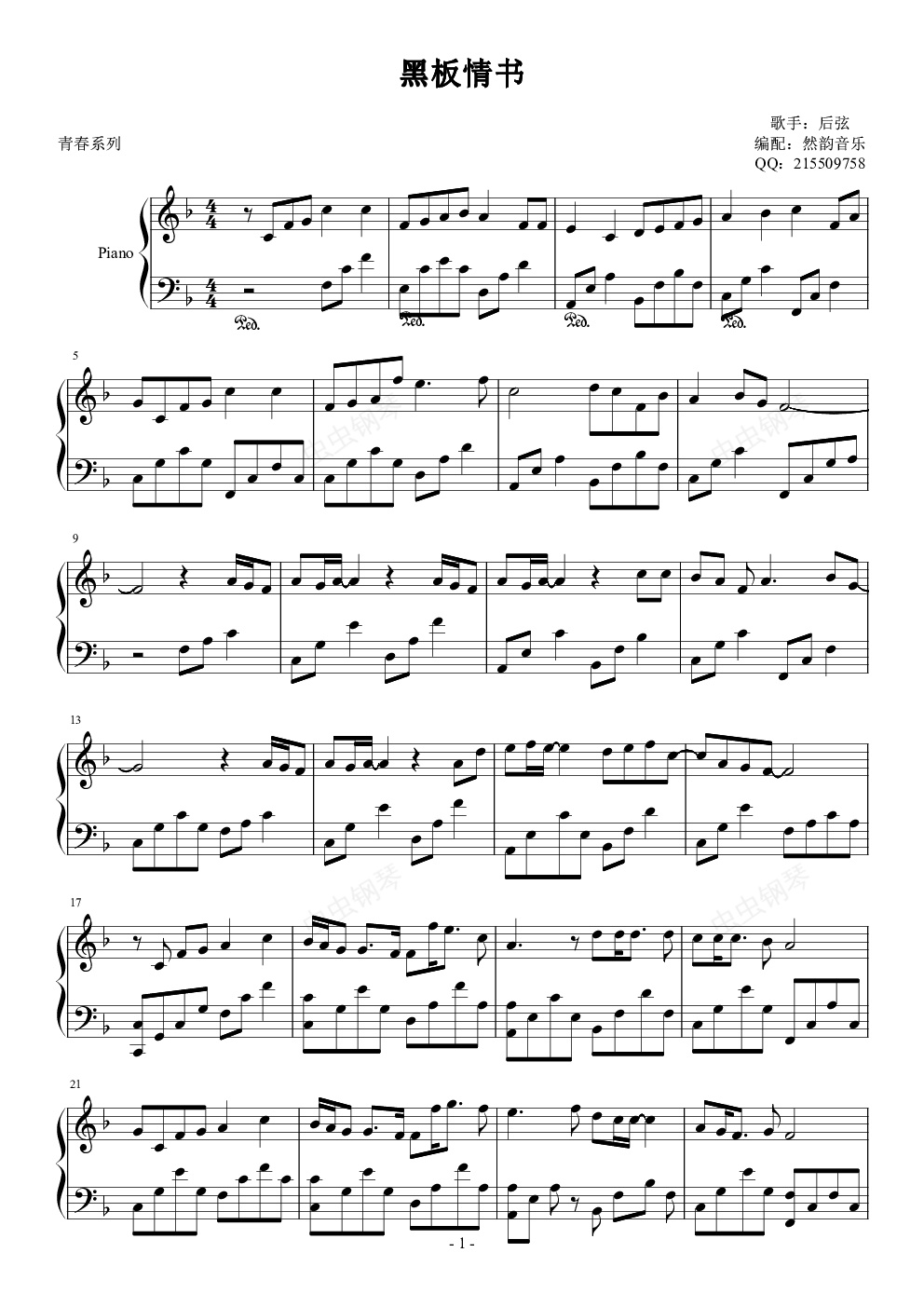 [IMG]/pu/2017/7/9/__5920__[/IMG]应网友请求,将后弦这首黑板情书改成钢琴版。我初时听得此曲,旋律轻快优美,个个音符似乎都在诉说着一个个青春爱情故事。我作为一名学生,深受其感。由于本人制谱经验尚缺,希望你们若有任何修改建议请加向我提出,我会第一时间修改。  演奏建议:踏板节奏把握好,中间部分的伴奏为了起华丽效果,加了一点点的爬音,若初学者觉得太难把握,可改成前面刚开始的简单伴奏。