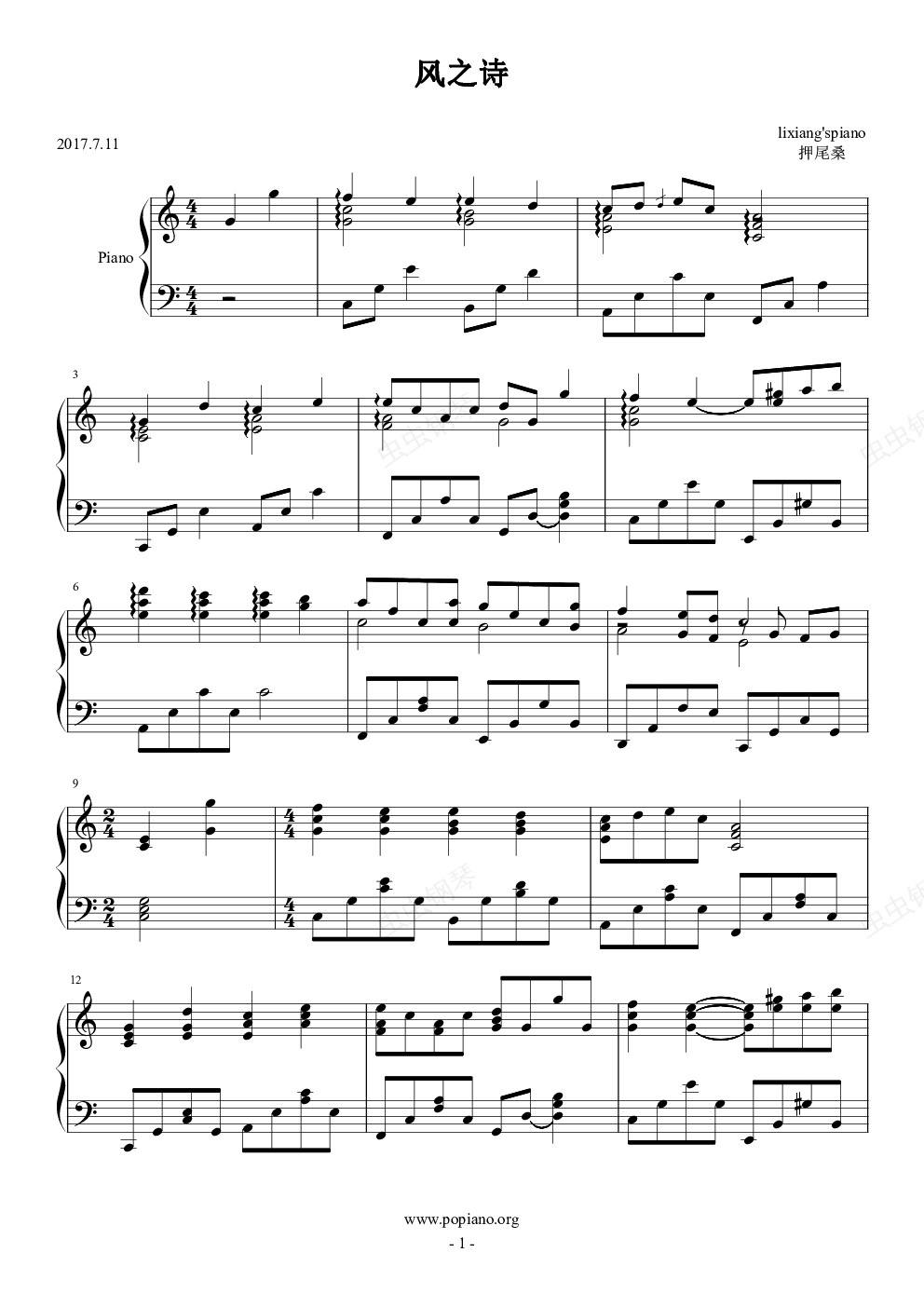 钢琴谱:风之诗(C大调简易版)