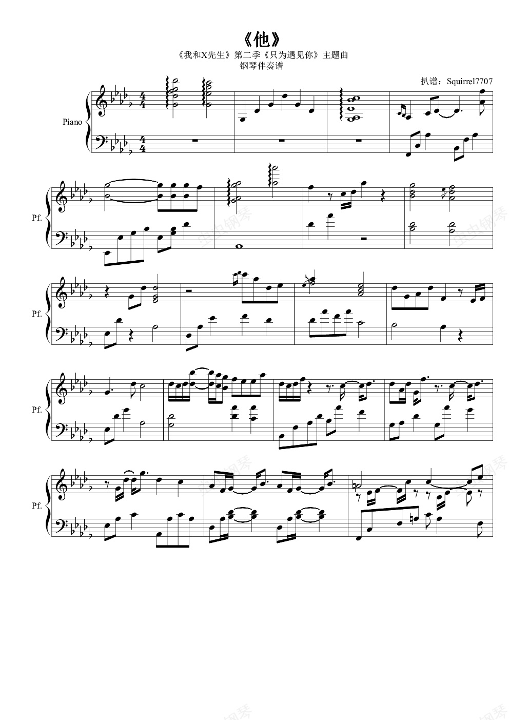 此谱系根据网络剧《我和X先生》第二季《只为遇见你》主题曲《他》编写的钢琴伴奏谱,编写时尽量原样模仿了原版中的伴奏,但同时也考虑到了一些地方由于原版中伴奏不是钢琴而导致的效果问题。总体来说,听起来与原版很像,专门适用于纯钢琴场合的伴奏。有些地方记谱稍有不规范,不过弹奏时可以轻易看懂,不影响阅览。对曲谱有任何问题请联系我。 注:此谱的midi试听效果极差,建议不要进行midi试听。我上传的原曲试听MP3文件是原歌的伴奏部分,并不完全是此谱本身,因为原歌伴奏除钢琴外还有其他乐器。如果想听此谱的完整呈现,请关注本页面下达人示范演奏一栏。