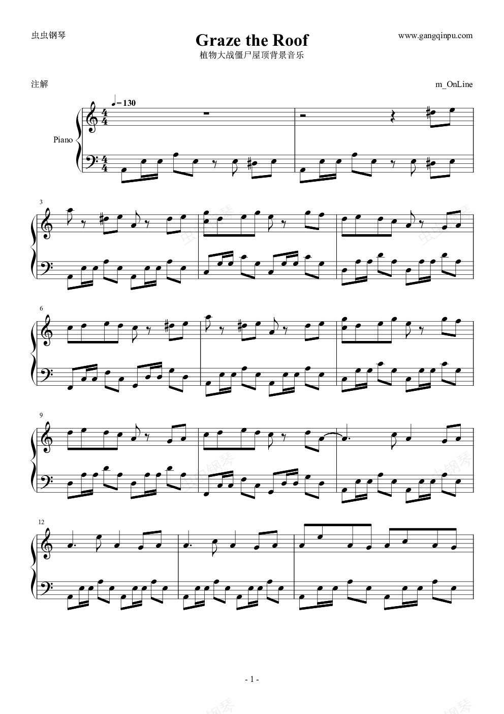 钢琴谱:植物大战僵尸屋顶背景音乐(Graze the roof)