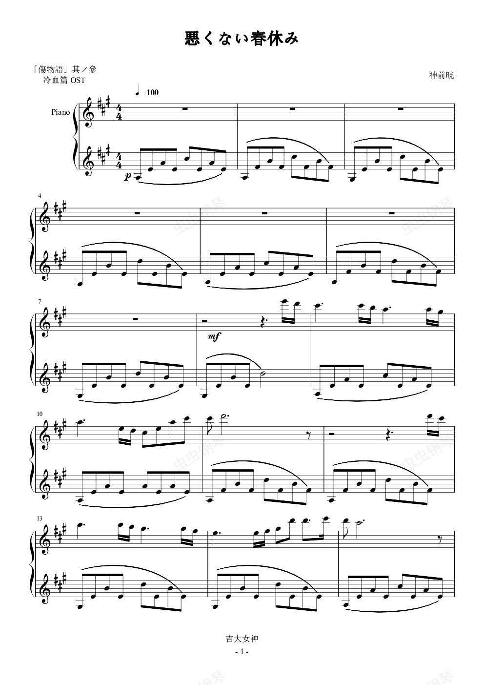 钢琴谱:悪くない春休み