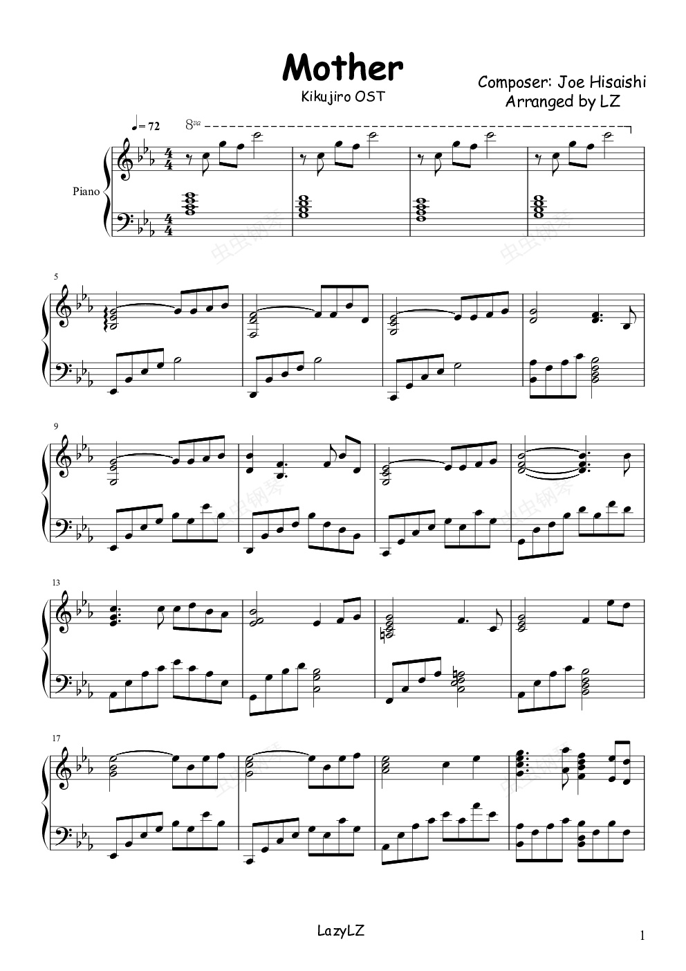 钢琴谱:菊次郎的夏天OST Mother(The Rain 短版)久石让
