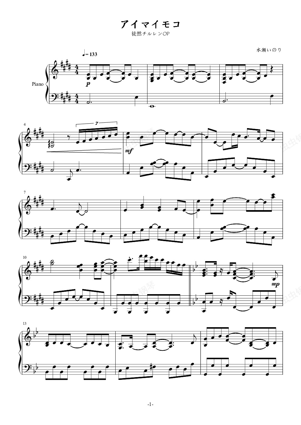 嘛,我编谱的时候所依据的视频似乎在已经有发布了,emmmm...那我这个就大概算是转载修改了(摊手~) ———————————————————————————— emmmm...从动漫开播我就在等谁来做一下这个谱子...然而我最终还是等不下去了(╯‵□′)╯︵┴─┴ 于是我又自己动手了...我尽力地去接近原曲,不过由于制谱软件有点问题,7连音那的midi试听一直不对,所以大家弹得时候自己把握吧。 嘛,七夕也就是28号了,送给大家满满的狗粮吧~