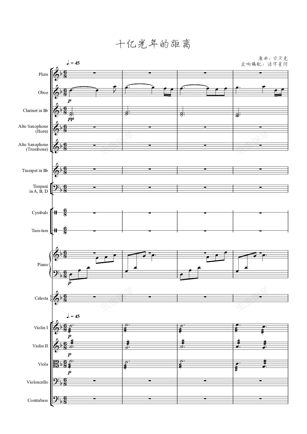 我的第一首和创作交响乐打擦边球的曲子…原曲是V.K克,想着他既然创作了那么多流行?的交响乐?(或者叫协奏曲?)为什么这首不这么做,于是就自己动了手进行编配(是的只是编配而已)= = 从六月份其实就开始了这个工程,整个暑假到回学校的前一天才把这个算是Demo的版本完成。 来讲讲这个谱子,我得承认我对于配打击乐是完全懵逼的,哪怕是伴奏或者和声声部我也能蒙出个四七二十八来,节奏声部真是硬伤,定音鼓完全是觉得“啊这里低音好弱”“啊这里节奏感好差”,想起来的时候才加进去的(所以可能定音鼓的分谱……休息100个小节?)镲和锣么就是制造气氛用的= = 一开始还打算放三角铁和小军鼓,然鹅音色库里没有音色我也很无奈(我才不会说我是懒得配更多打击乐了)。 不知道为什么今天补完第二段和结尾给我的感觉,第二段远不如两个月前编的第一段,没有达到预期的音效,看来是小曲子搞多了思路有点僵硬。 至于这个乐团是什么配置,为什么会有萨克斯括弧圆号这种奇怪的东西,emmmm,很遗憾这是我根据自己学校乐团的配置进行的编配,我们乐团没有圆号没有长号,于是有十来个萨克斯就被“合理”分配到圆号1234和长号123去了,这个谱子上圆号和长号都只有两个声部,我想着10个萨克斯分出7个声部音效一定很奇怪就没有分很多(其实也是懒) 总而言之这可能是我短期内的最后一个作品,感谢V.K克的原曲(我从没打错过克总的名字),勉强算是和梦寐以求的交响乐来了一次接触,yes。希望能以后能在音乐的路上自力更生越走越远。