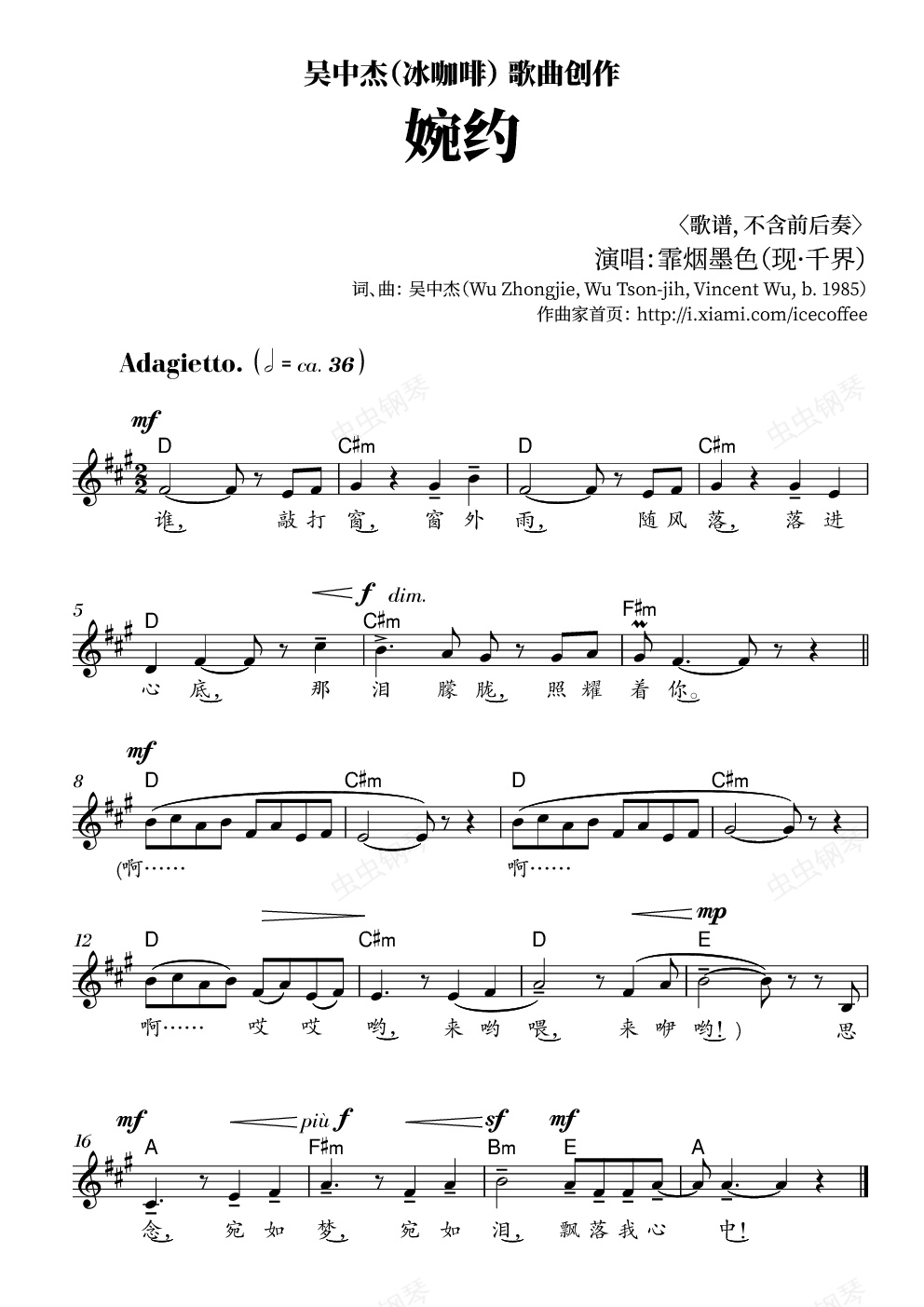 来者莫问我姓名;我只是一个传谱的。如果一定要我表个态,我就明确告诉你:“任何人都没有义务接受/喜欢任一特定艺术风格;同时,任何人都没有权利干涉他人对此特定风格的接受或喜爱。”,换句话说,你可以喜欢你的“乡村农金”,我可以喜欢我的“高雅古典”,各得其乐各取所需,本来没必要争吵的;在以往,可能由于意识形态管控的原因,加上人耳听觉规律,某些特定的艺术风格有更高的几率被推崇,与之在内容形式或含义上相反的艺术风格就有更高几率被贬低、压制。然而如今这个时代早就过去了。就酱。// 冰咖啡的汉族音乐和日本同人相关的作品,我感觉“乐而不淫,哀而不伤。”这必定是一种经典。不加以挽救将永久失去这宝贵遗产。支持我冰粉甲就是支持冰咖啡,贬低我就是继续沉默的螺旋。总之,取其精华,去其糟粕,不愿再多说。我只传谱,一切其它活动与我无关,到此一传,传完就走,保留遗产,传之后人。只要冰咖啡作品在虫钢上留着就行,赞还是批都与我无关,但我永不会忘记他的恩德。更多请不要打扰我了,我也很忙啊,谢谢体谅!
