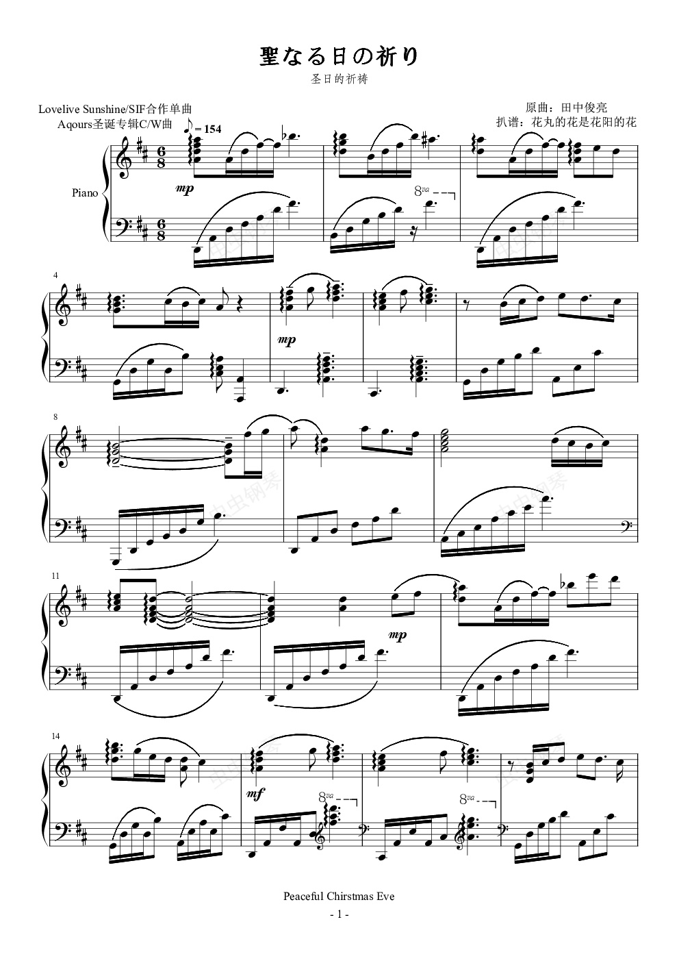 本来是打算国庆假期再发新谱的,但想来想去还是决定用周末周一周二做出了这一曲。第一次扒水团的谱子,水团圣诞歌原曲真的很美很美,但前奏和部分左手伴奏的确不甚友好,个人感觉甚至可以拿来练习识谱和指法……这首《圣日的祈祷》作为一个C|W曲,所以可能了解的人比较少,希望不会冷场……第一次了解这首歌的同学可以去听原曲,这是一首能让人平静下来的歌。另外一提,在雪夜或平安夜食用效果最佳。预告:早就想做水团另外一首很美很美很美的曲子《天空与心灵皆能雨过天晴》,下一首应该就会是这个,而且不出意外应该会非常简单。各位有什么其他建议也可以直接和我说。最后提前祝各位国庆快乐,长假愉快。[IMG]/pu/2017/9/27/__6111_019_[/IMG]2018.5.2 更新音源