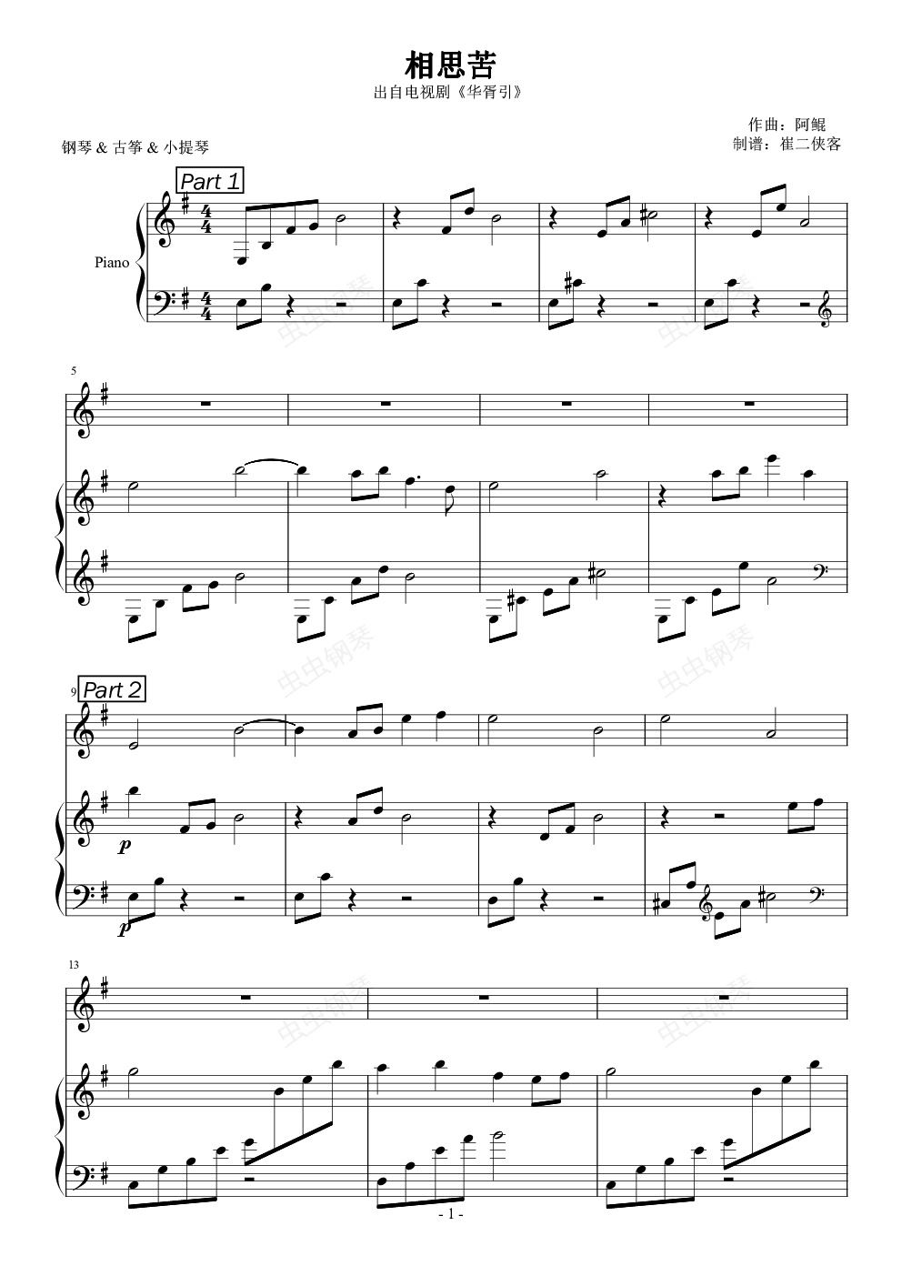 出自电视剧《华胥引》应该是“十三月”单元插曲(猜的)。故事大概如下:郑国景侯容垣阴差阳错地娶了容浔府杀手莺哥为妻,并彼此相爱。他一直都是个以命护莺哥的男人,即使最后不幸中毒,为了护住莺哥,也宁可孤独死去。他的死的时候有远山的温泉氤氲、漫天的红樱飞舞、晚照华丽又苍凉地送葬、一片火海映得他苍白俊秀的容颜分外好看。他握着与莺哥“相思入骨”的定情信物、温柔而安详地渐渐沉入水底……莺哥与容垣生死相随,同穴而眠。世间无十三月,人世再无莺哥。长不过十三月的爱情,似一场繁华凋零。(以上陈述来自百度百科)我用小提琴把原曲中二胡部分代替了,因为我有会拉小提琴朋友的而没有会拉二胡的。如果哪位二胡爱好者有意向跟我合奏曲目,并且在河北石家庄的话,可以跟我联系,纯属课余娱乐,欢迎欢迎。再有,古筝多用简谱,想要此曲简谱部分的朋友欢迎微信联系我,随时恭候。[IMG]/pu/2017/10/5/__8573_63021_[/IMG]