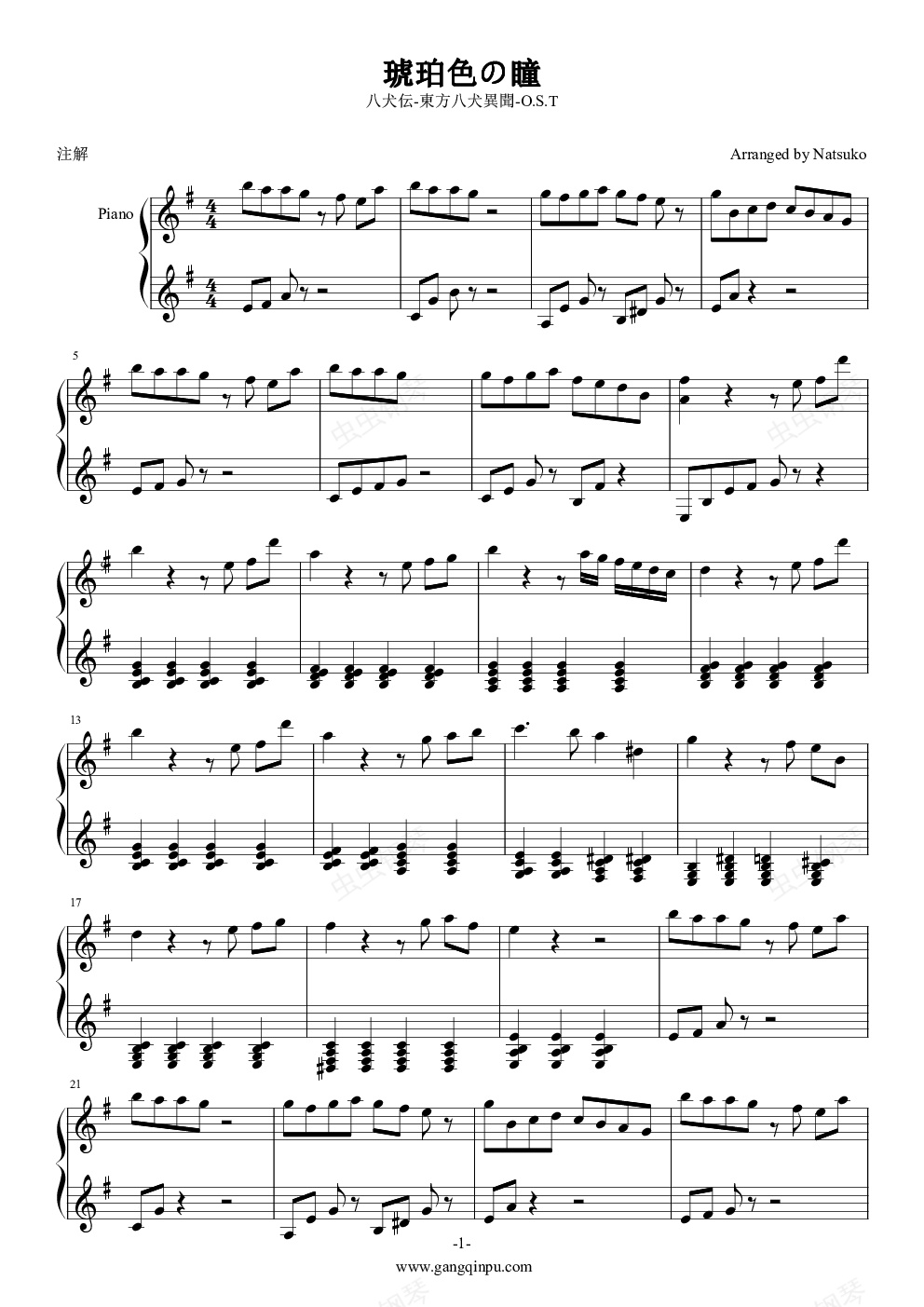 钢琴谱:八犬传-东方八犬异闻-OST-琥珀色の瞳-