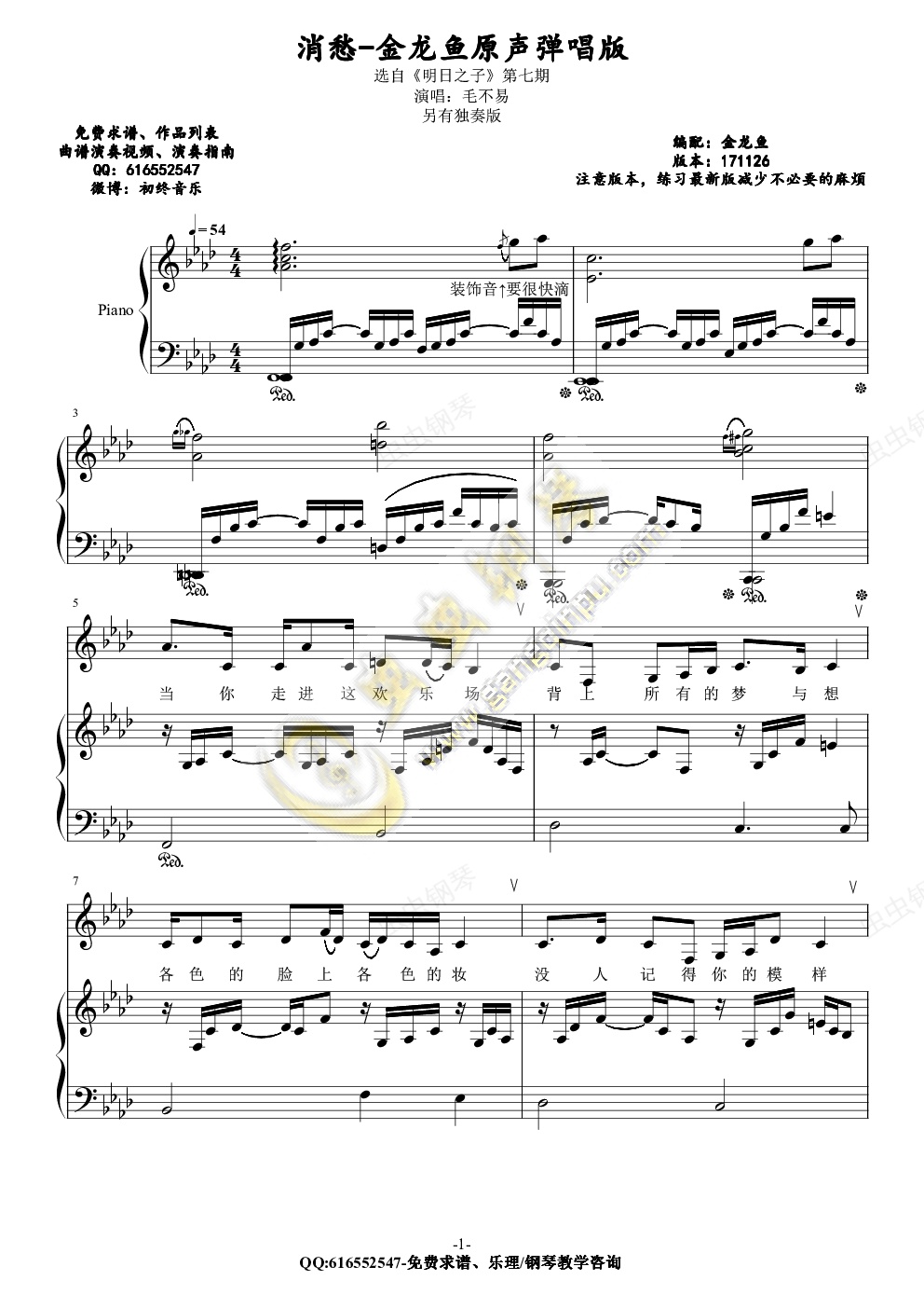 钢琴谱:消愁-金龙鱼原声弹唱版171126