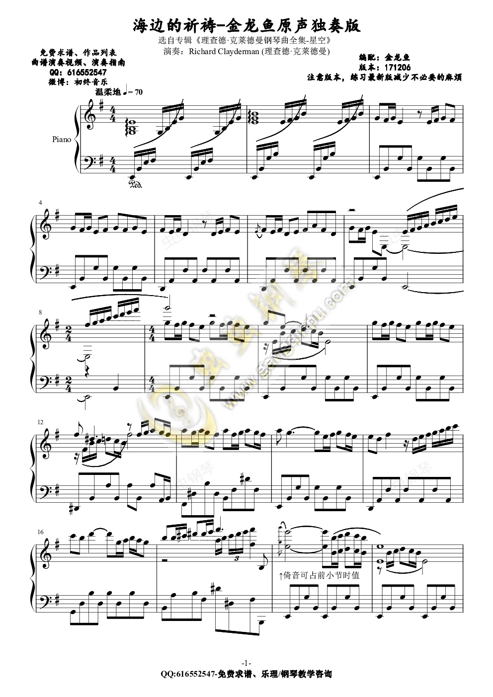 钢琴谱:海边的祈祷-金龙鱼原声独奏版171206