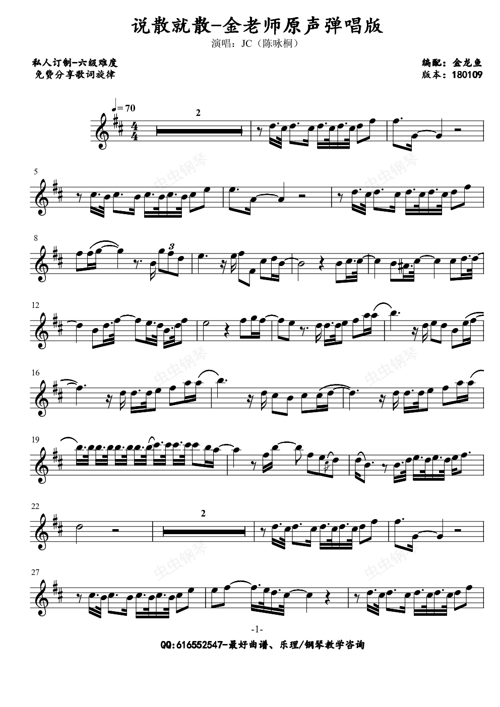 钢琴谱:说散就散-金老师原声旋律谱