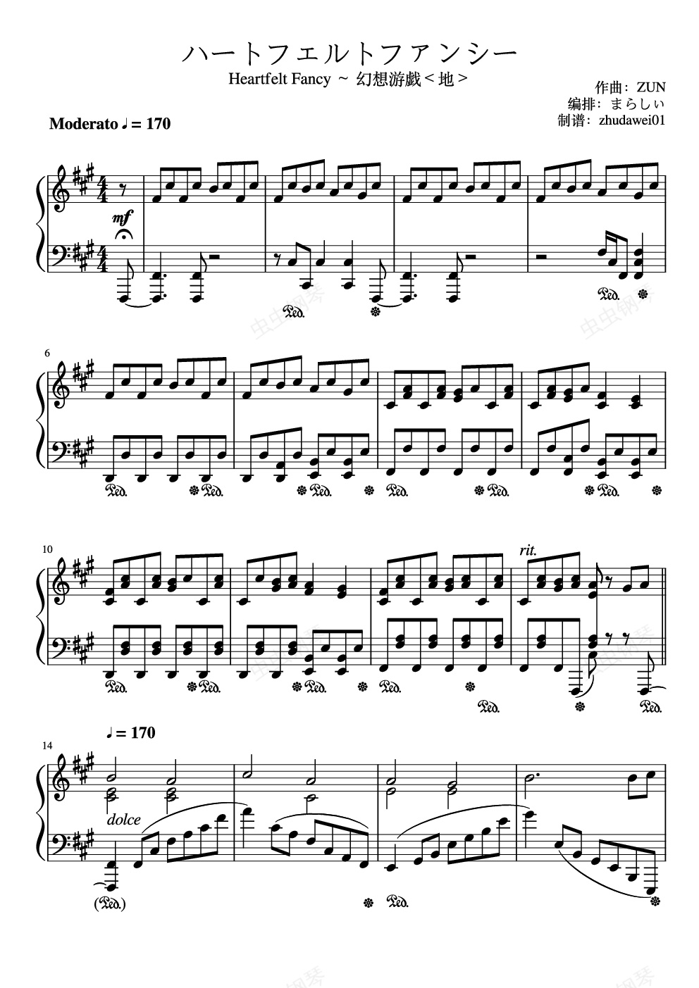 来自幻想游戯<地> ——地灵殿4面道中曲,在地灵殿大厅初见猫车。整首歌充满了迷幻色彩,心中暖融融的感觉,会不由自主地想听一遍又一遍。的编曲没有结尾,结尾是我自己加的。[IMG]/pu/2018/1/19/__5039__[/IMG]扒谱扒到吐血,原曲听到耳朵生茧,感觉弹起来不太容易。2018/1/21 修改尾声以及小节线和踏板;版面整理;增加了演奏注释1/23 谱面整理,作品说明增加个人感受。1/26 修复失效的原谱试听6/11 修改第37节的错误、替换音源、重新排版