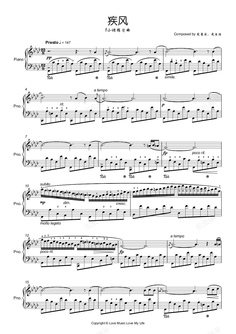我身在迷宫之中,迷失了方向。忽有一阵疾风吹过,我试图跟着风找寻迷宫的出口,却发现风向是乱的。这时环顾四周,我依然身处迷宫,迷失其中。----------------------------------- 以上均为作者本人意淫 -----------------------------------f小调练习曲,比较良心地写了指法,亲测可弹(虽然根本不会有人去弹)。。。----------------------------------- 以下为作者自问自答 -----------------------------------问:为什么曲子那么短,只有一分半?答:写不下去了有意见啊?!问:跑动只有那么一会儿,有什么练习效果啊?答:我水平差,写的时候只能跑那么一会儿,你有意见啊?!问:你怎么总是说我们这些提问的对你有意见啊?答:你有意见啊?!----------------------------------------------------------------------各位大佬要喷就喷吧 > <